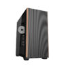 The left side of the case features a tempered glass panel to expose the computer’s interior – including fan backlighting and components. An additional wood-style accent on the front adds a subtle but original touch.