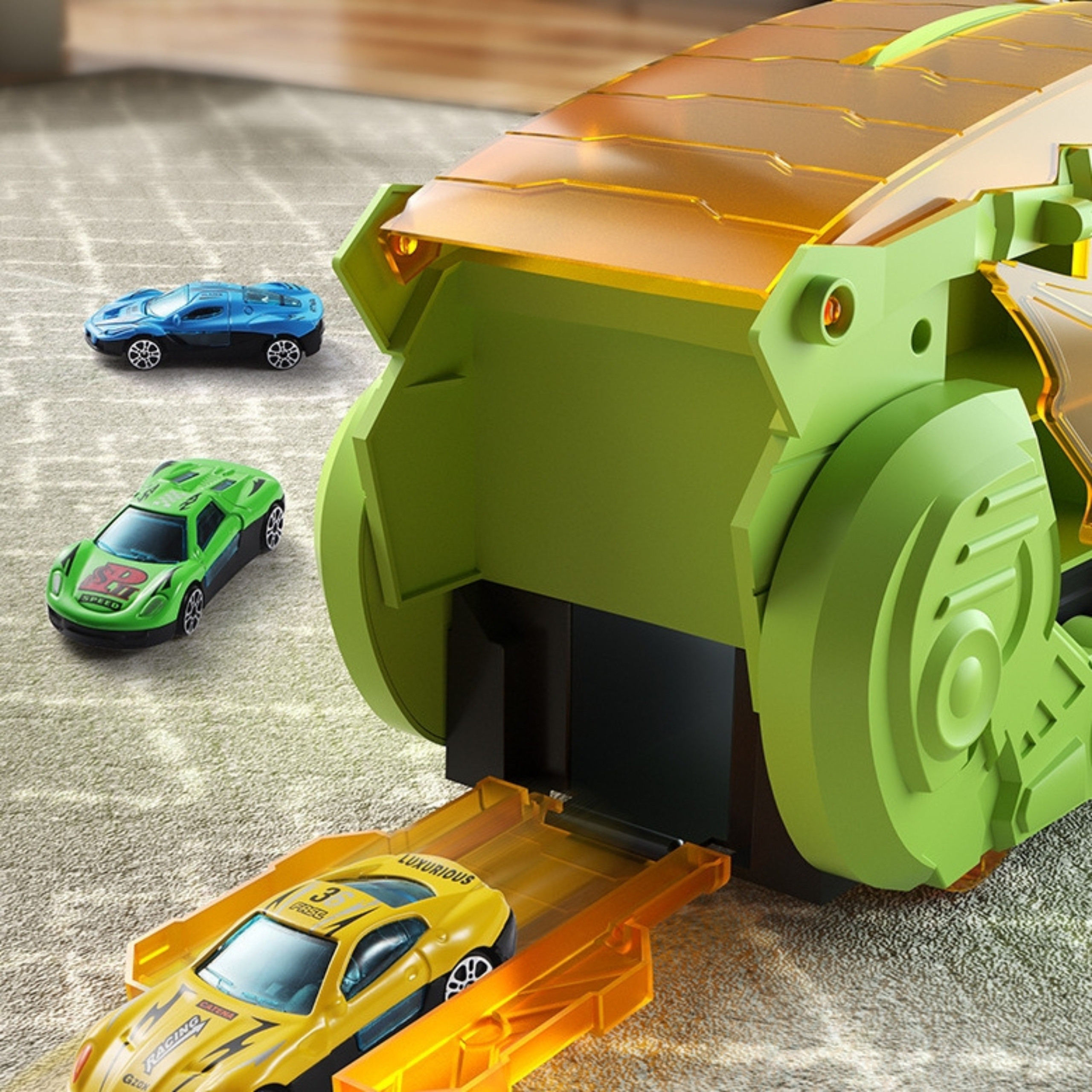 Kasutamine on lihtne ja intuitiivne. Avage dinosauruse-veok, et paljastada liumägi ja võidusõidurada. Asetage autod rajale ja laske neil kihutada. Kui mäng on lõppenud, pange kõik autod tagasi veoki sisse ja sulgege kohver, et hoida kõik korras ja organiseeritult.