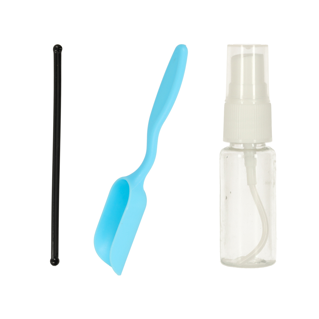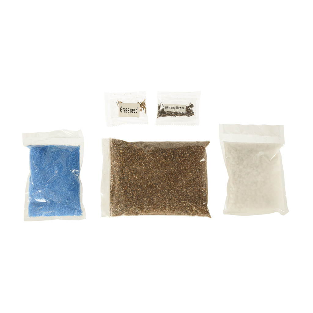Komplekt sisaldab konteinerit kaanega, mulda, valgeid ja siniseid kive, kolme dinosaurust, kühvlit, veeanumat, kleebiseid, pulka ning rohu- ja kosmoseõie seemneid. Toode on pakitud kartongpakendisse.