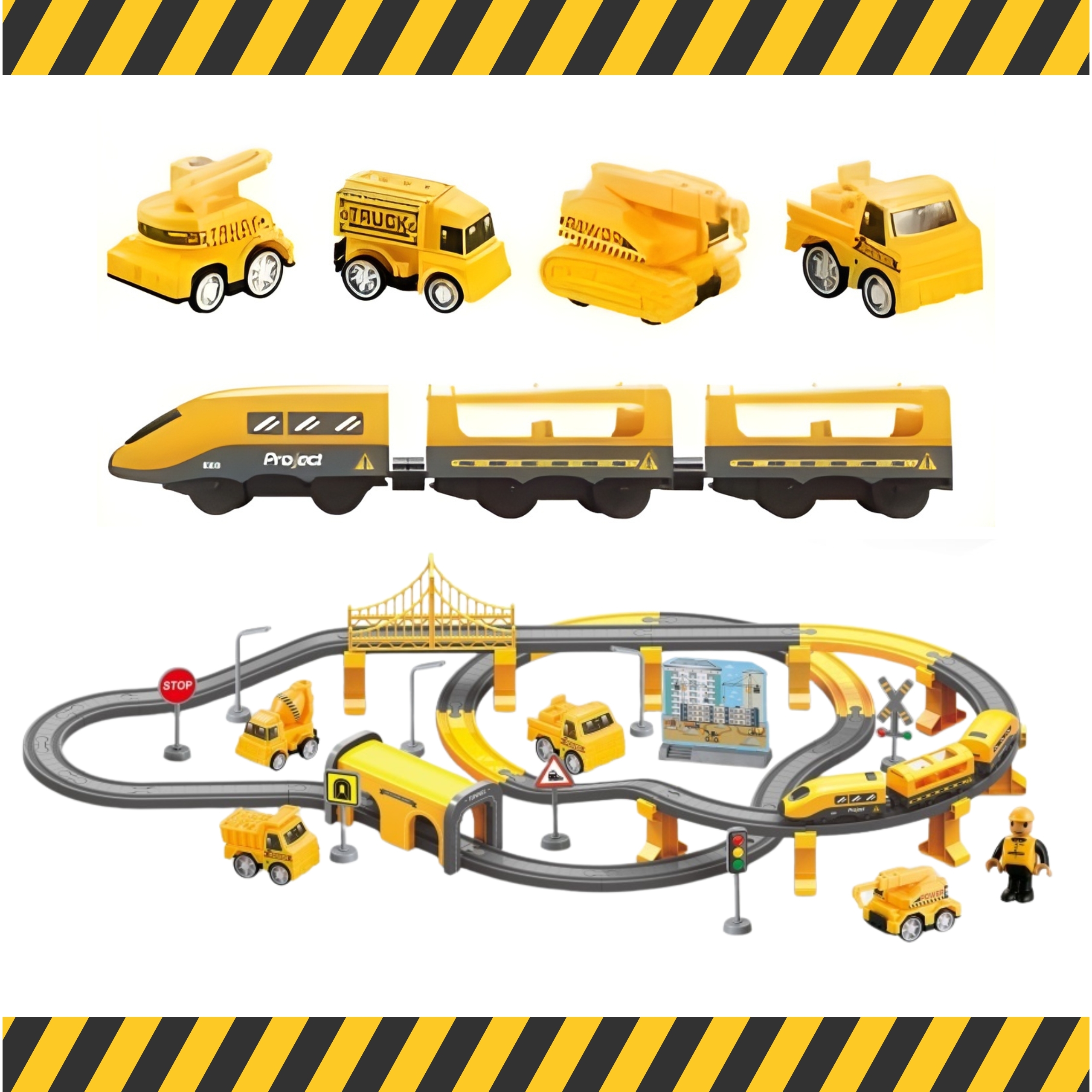 Komplekti kuuluvad elektriline rong, kaks vagunit, 27 rööpaelementi, rippsild, tunnel, raudteejaam koos linnahoonega, neli ehitusmasinat, ehitustöötaja figuur, kaks valgusfoori, kolm liiklusmärki, kaks tänavalampi ja üheksa tugiposti kõrgkonstruktsioonideks.