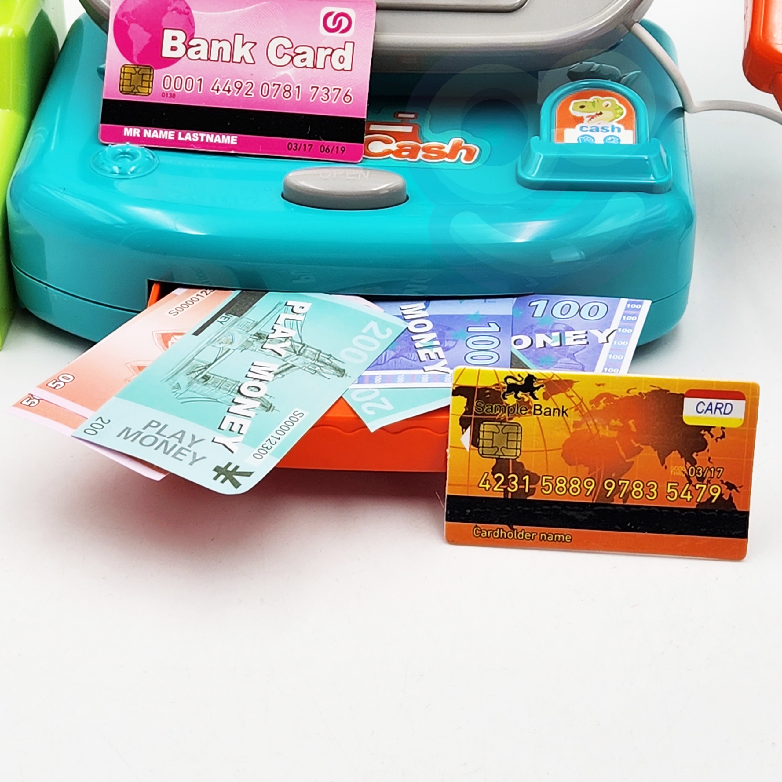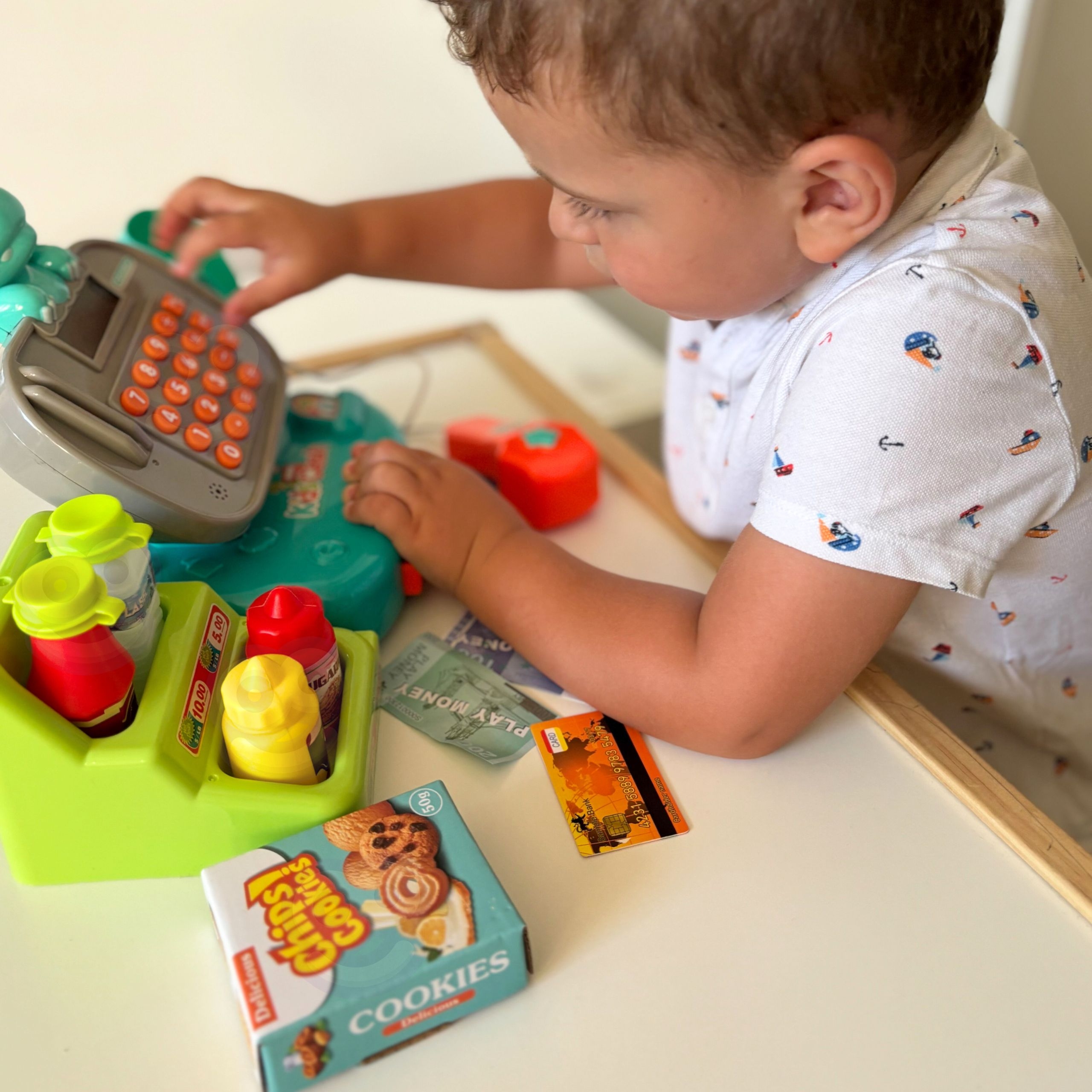 Komplekt sisaldab kassat koos kalkulaatori ja rahasahtliga, interaktiivset triipkoodilugejat, kahte pangakaarti, mänguraha, kahte riiulit toodetele ning miniatuurseid pudeleid ja karpi küpsistega. Lapsed saavad mängida rollimänge, arendada oma kujutlusvõimet ja õppida raha käsitlemist.