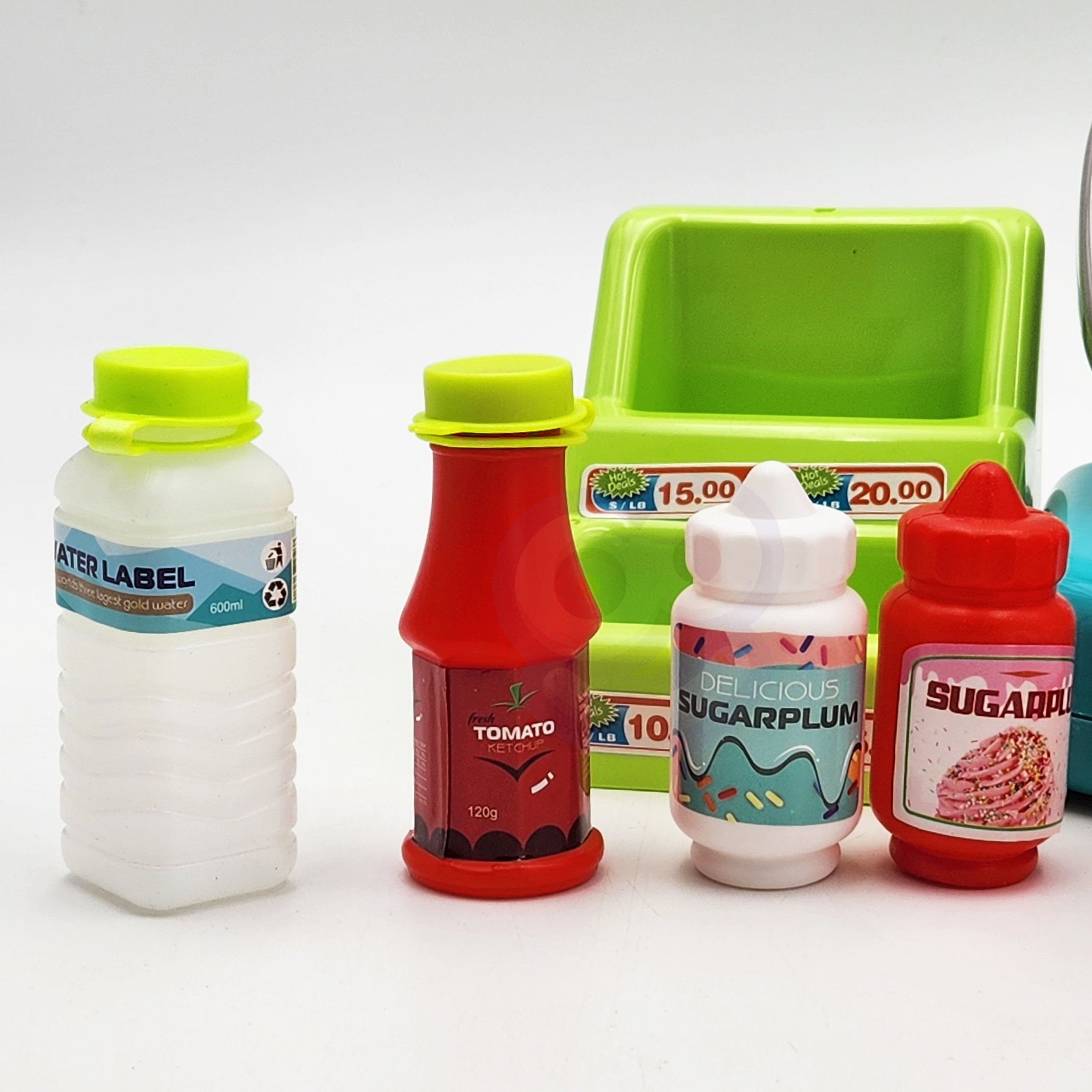 - Realistlikud mängutooted nagu pudelid ja karbid