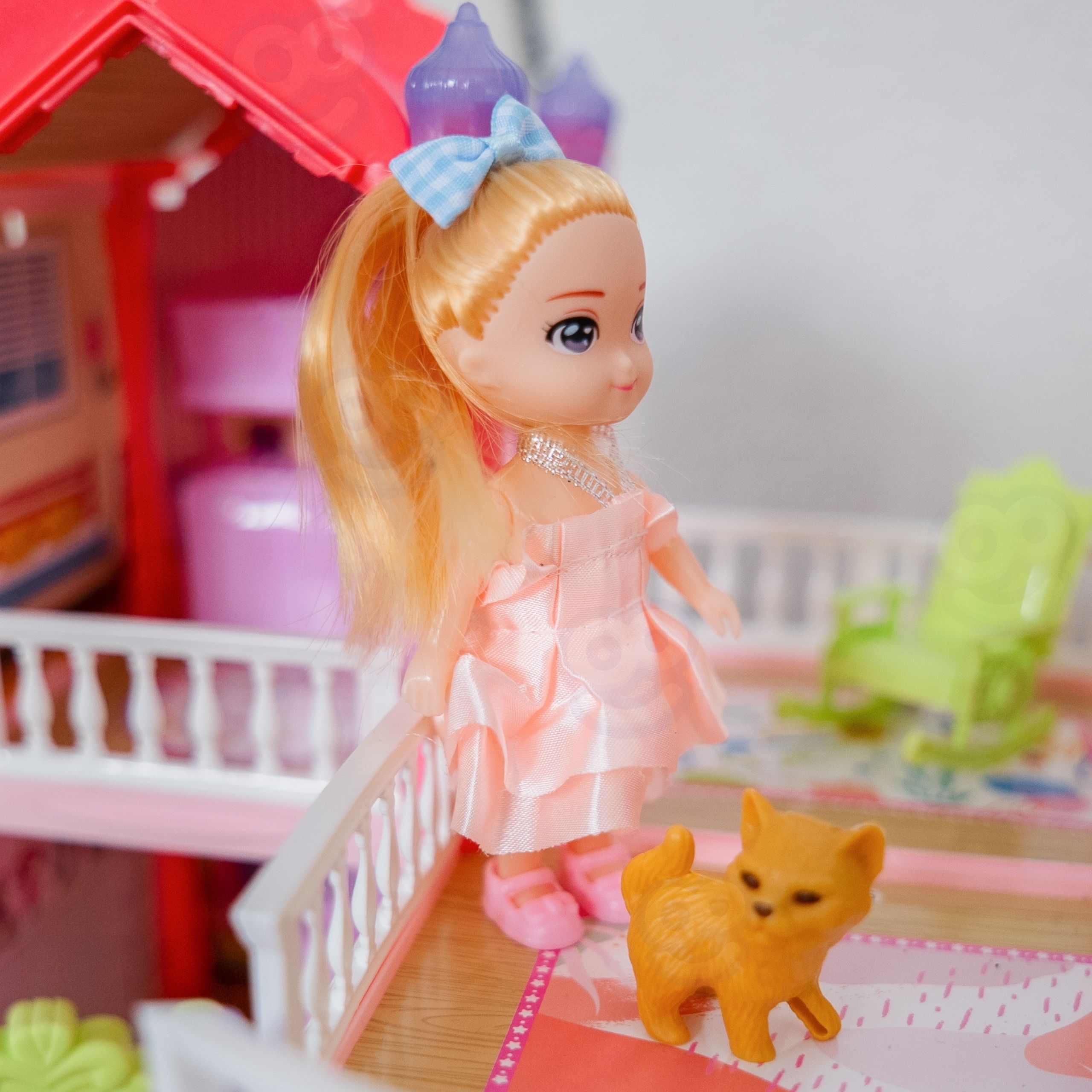 Komplekt sisaldab kahekorruselist maja 6 toa ja rõdudega, 1 nukku ja 1 kassi (saadetakse juhuslikult). Lisaks rikkalik mööblikomplekt: voodid, diivanid, kapid, kamin, lambid, lauad, köök, toolid, klaver, televiisor, tualettlaud, häll, kiik ja palju muud. Samuti dekoratiivsed elemendid: sambad, tornid, balustraadid, trepid.