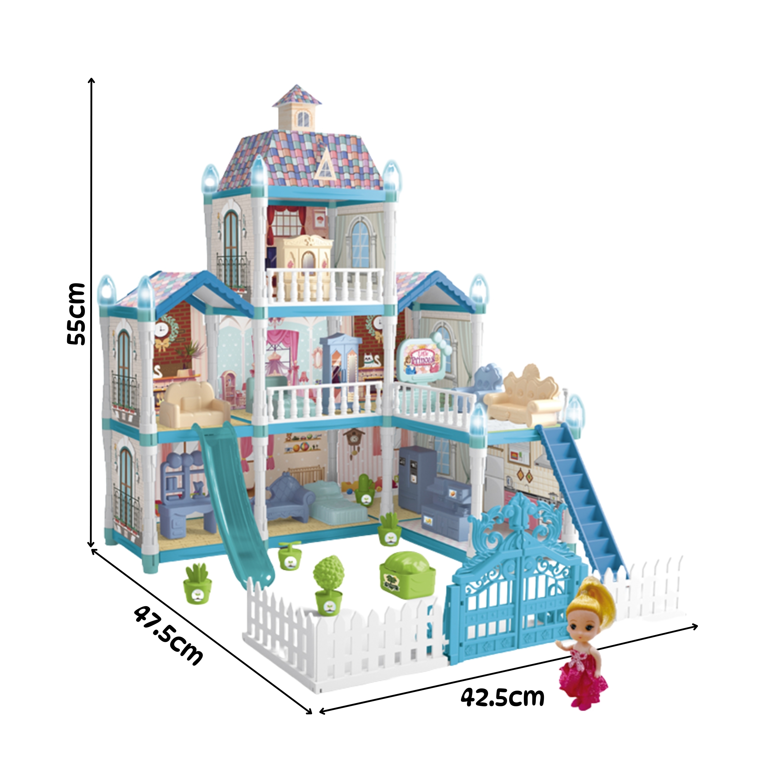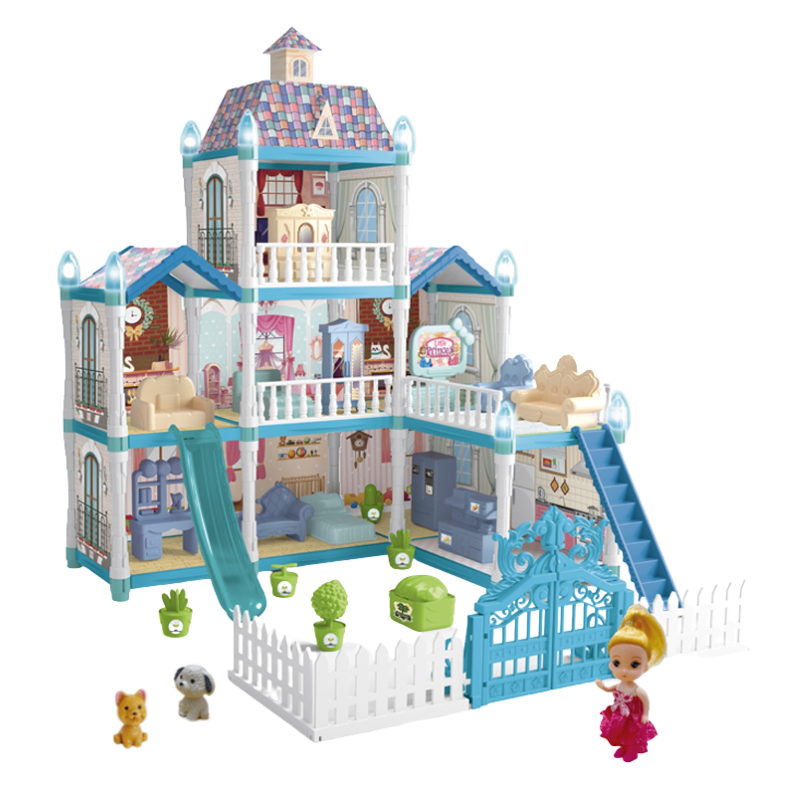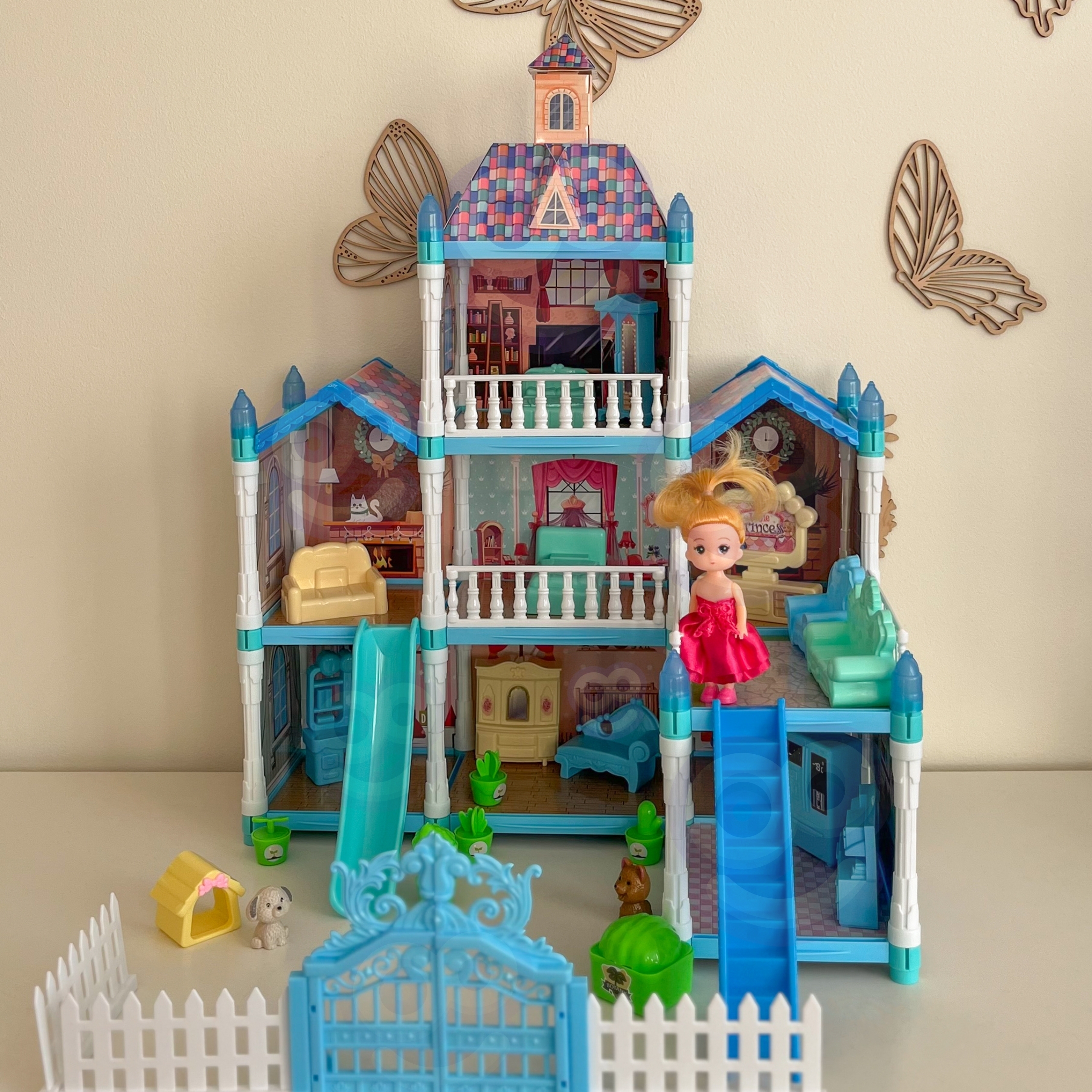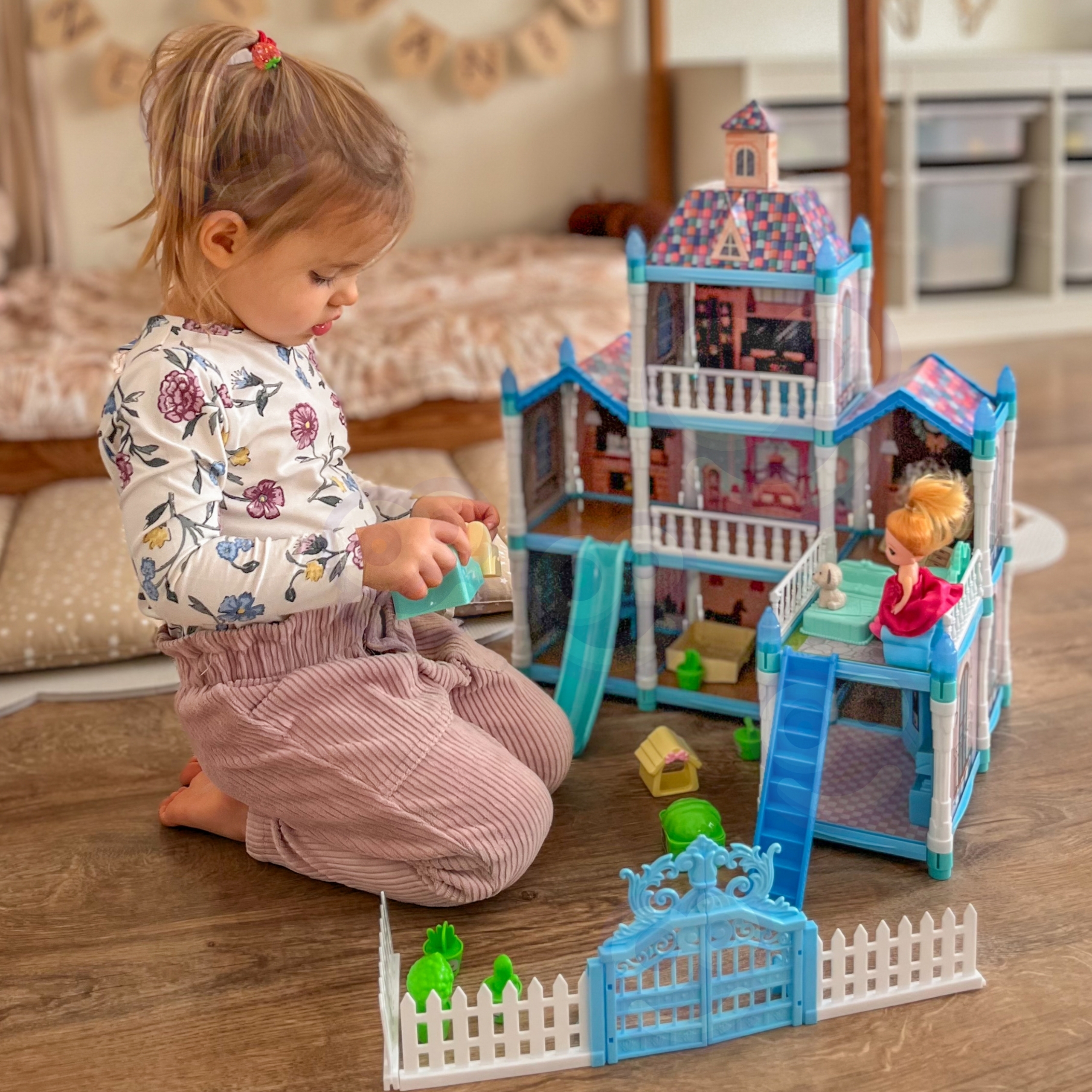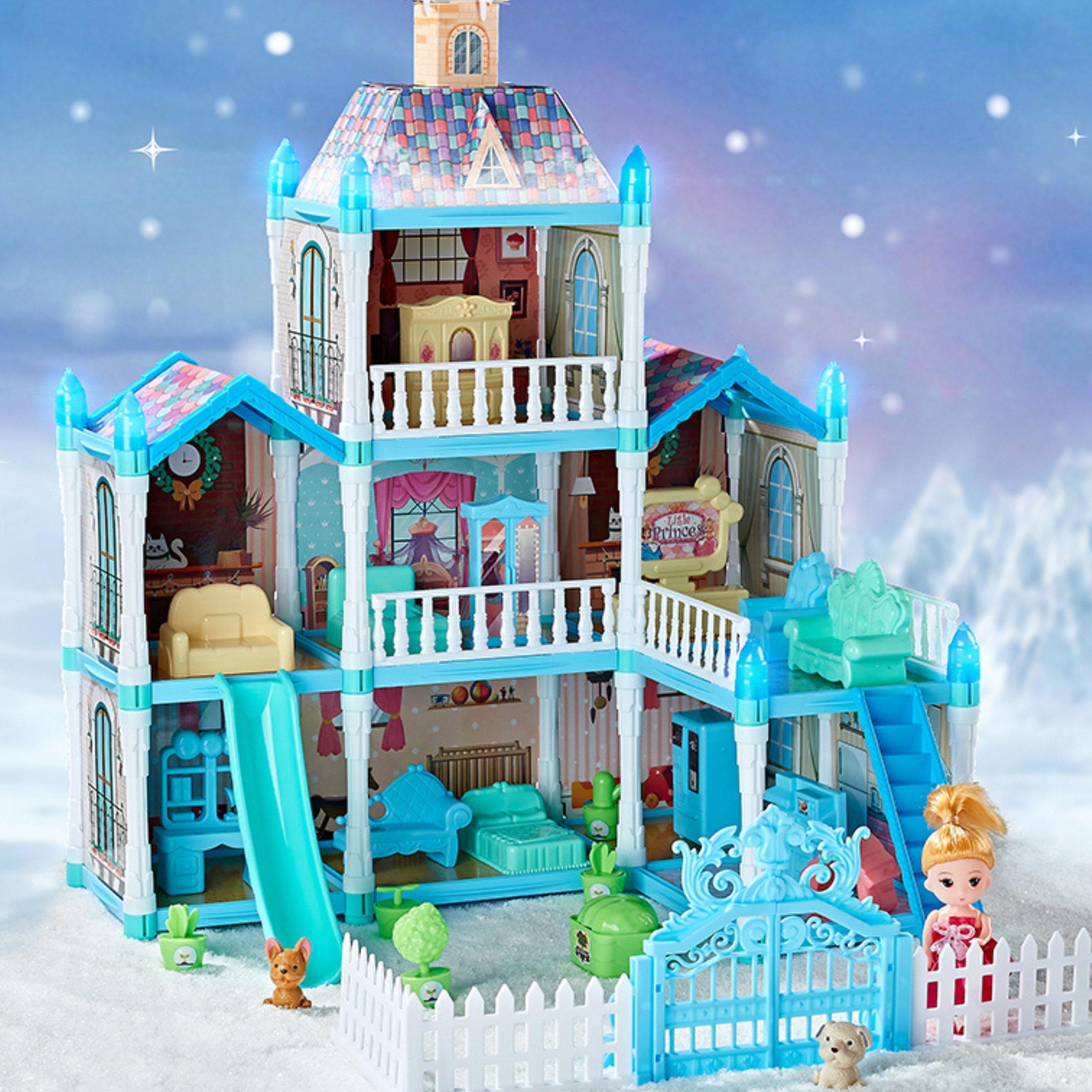 Avasta maagiline mängumaailm selle kolmekorruselise nukumajaga, mis pakub lõputuid võimalusi loominguliseks mänguks. Komplekt sisaldab 191 elementi, sealhulgas nuku, kaks loomakest ja rikkalikku sisustust, samuti kauneid, pimedas helendavaid dekoratsioone. Nukumaja on kujundatud talveaia inspireeritud sinise ja roosa värvigammaga, mis teeb sellest ideaalse kingituse.