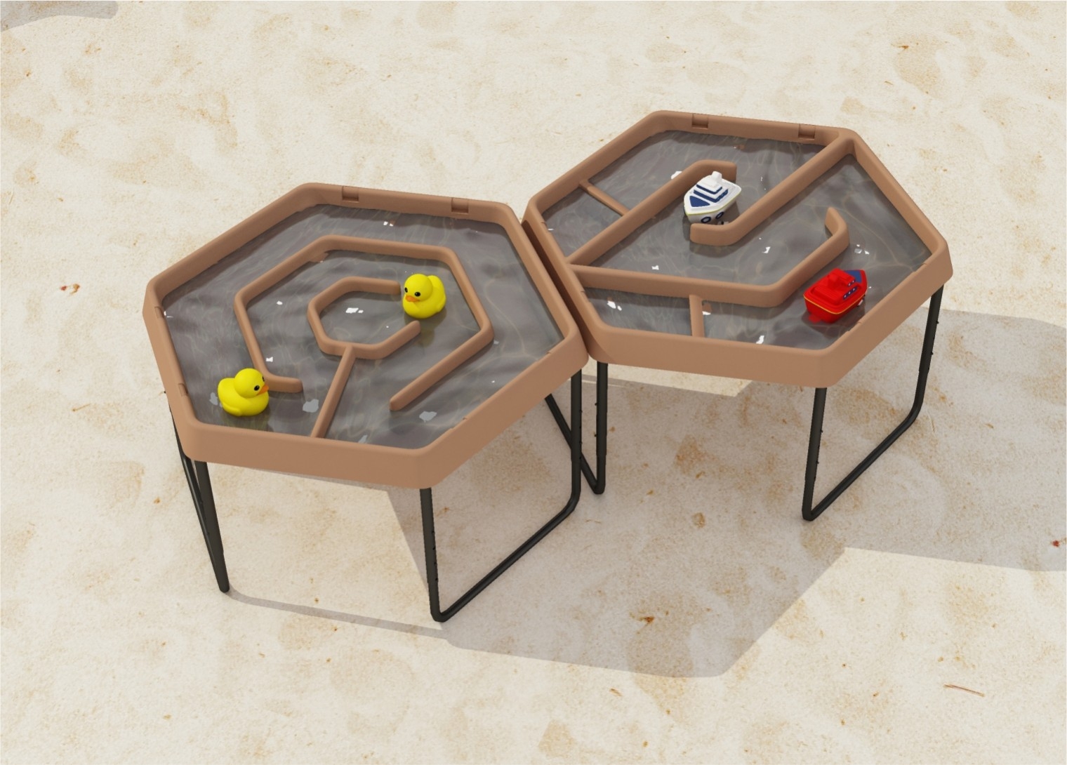 Kuusnurkne liiva- ja veemängulaud pakub lastele lõputuid võimalusi avastamiseks ja loovaks mängimiseks. Lapsed saavad jälgida, kuidas veevool suunab paate ja mängukanuusid mööda käänulisi kanaleid, pakkudes põnevaid eksperimente ja mängulisi hetki. Reguleeritava kõrgusega stabiilne metallraam ja veerajad loovad ideaalse keskkonna erinevateks teaduskatseteks ja meeskonnamängudeks.