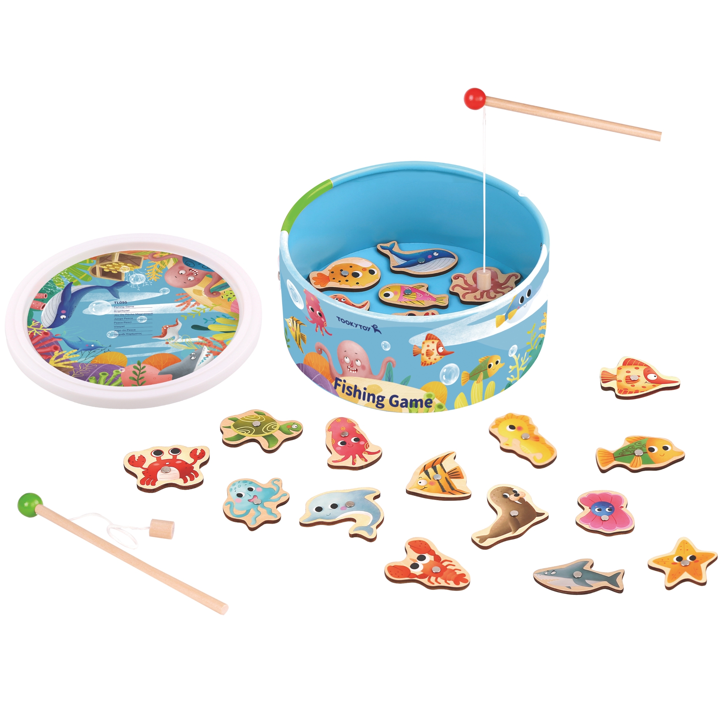 TOOKY TOY Gra Łowienie Ryb zestaw składający się z 22 elementów z wizerunkiem zwierząt oraz z wbudowanymi magnesami. Dwie drewniane wędki oraz wiaderko imitujące świat podwodny zapewni długie godziny zabawy. Gra pozwala na zabawę nie tylko jednej osoby, ale i gromadki urwisów. Całość wykonana została z drewna lakierowanego i pomalowana nietoksycznymi farbami w żywe barwy, które zadowolą każdego użytkownika i dadzą mnóstwo radości z zabawy. Gra ćwiczy koordynację ruchową i wspiera relację ręka-oko oraz uczy cierpliwości i skupienia. Wędki w dłoń i czas zacząć łowy!