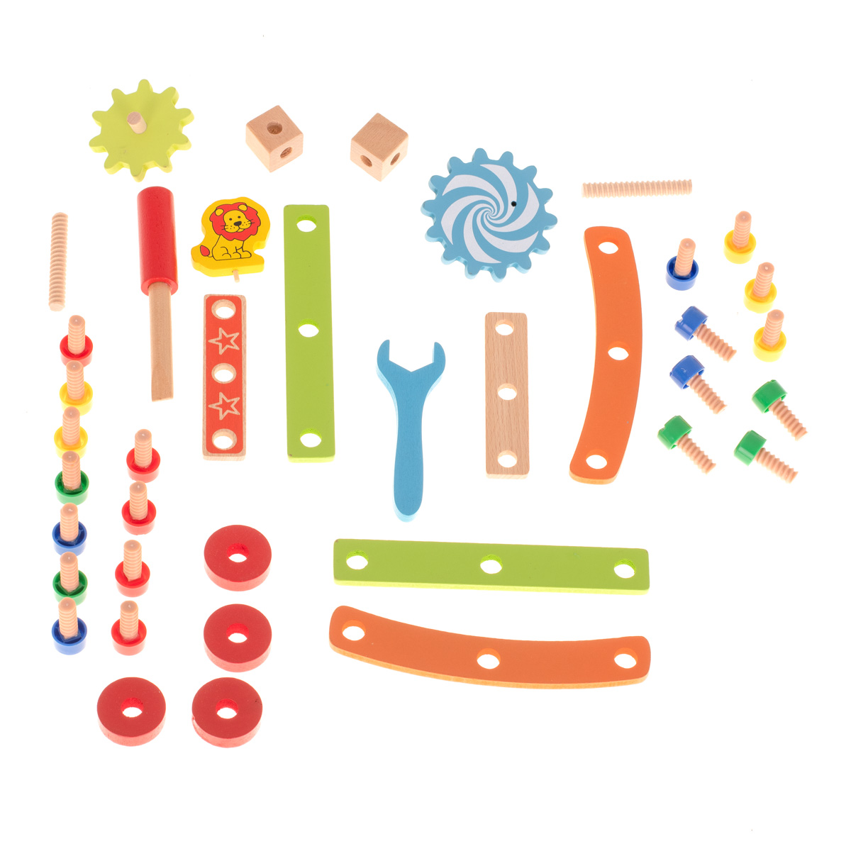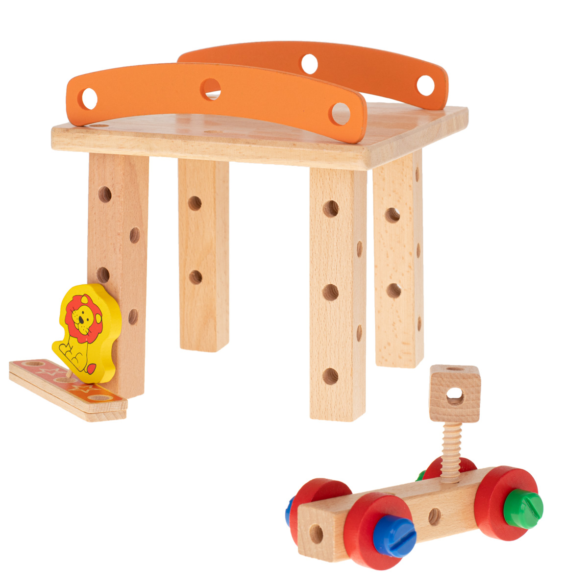 See värvikas puidust ehituskomplekt on suurepärane mänguasi, mis võimaldab lastel ehitada töökoja koos tooli funktsiooniga ning luua erinevaid konstruktsioone. See arendab lapse motoorseid ja analüütilisi oskusi ning parandab käelisi oskusi. Komplekti mitmekülgsus stimuleerib ruumilist kujutlusvõimet ja aitab keskendumisvõimet treenida.