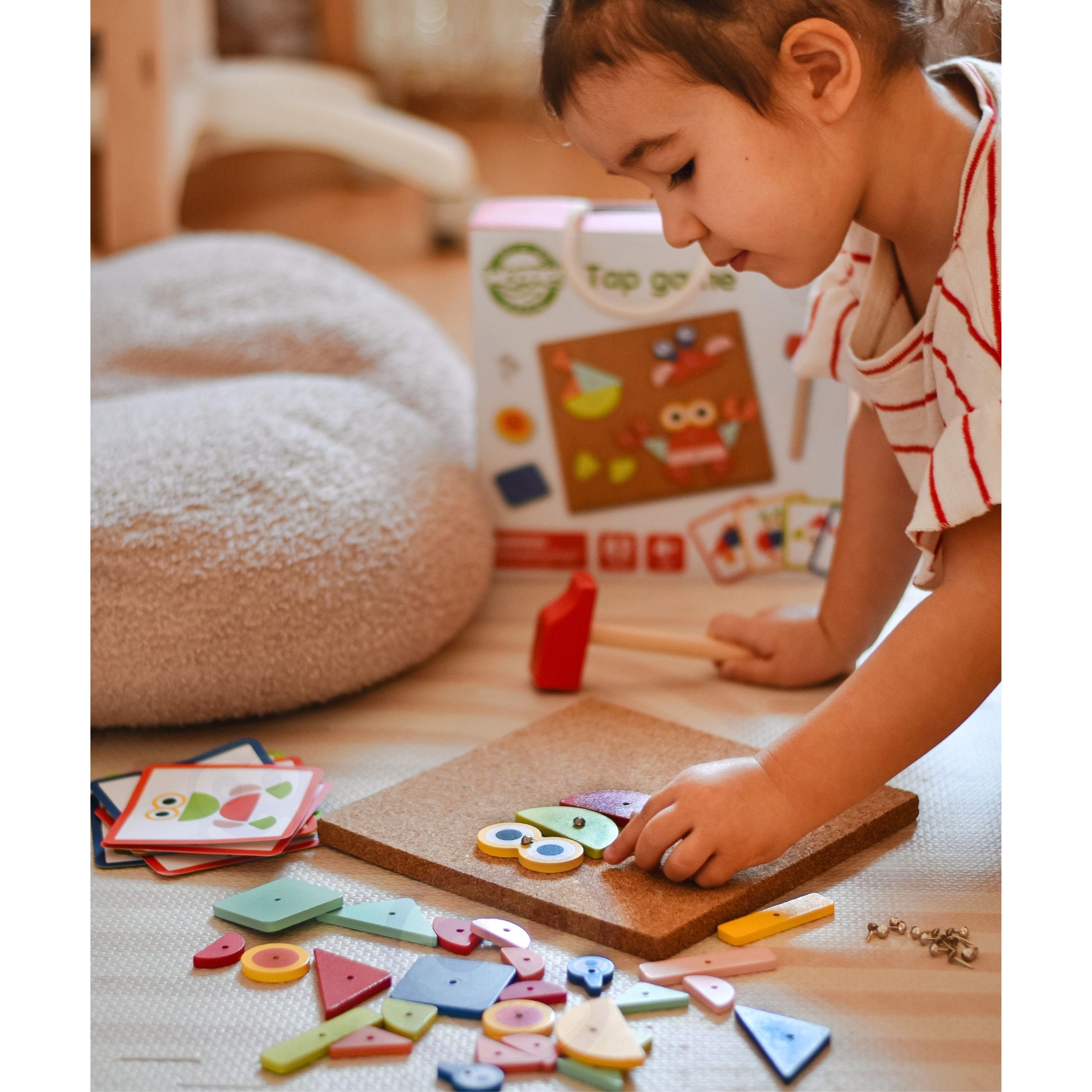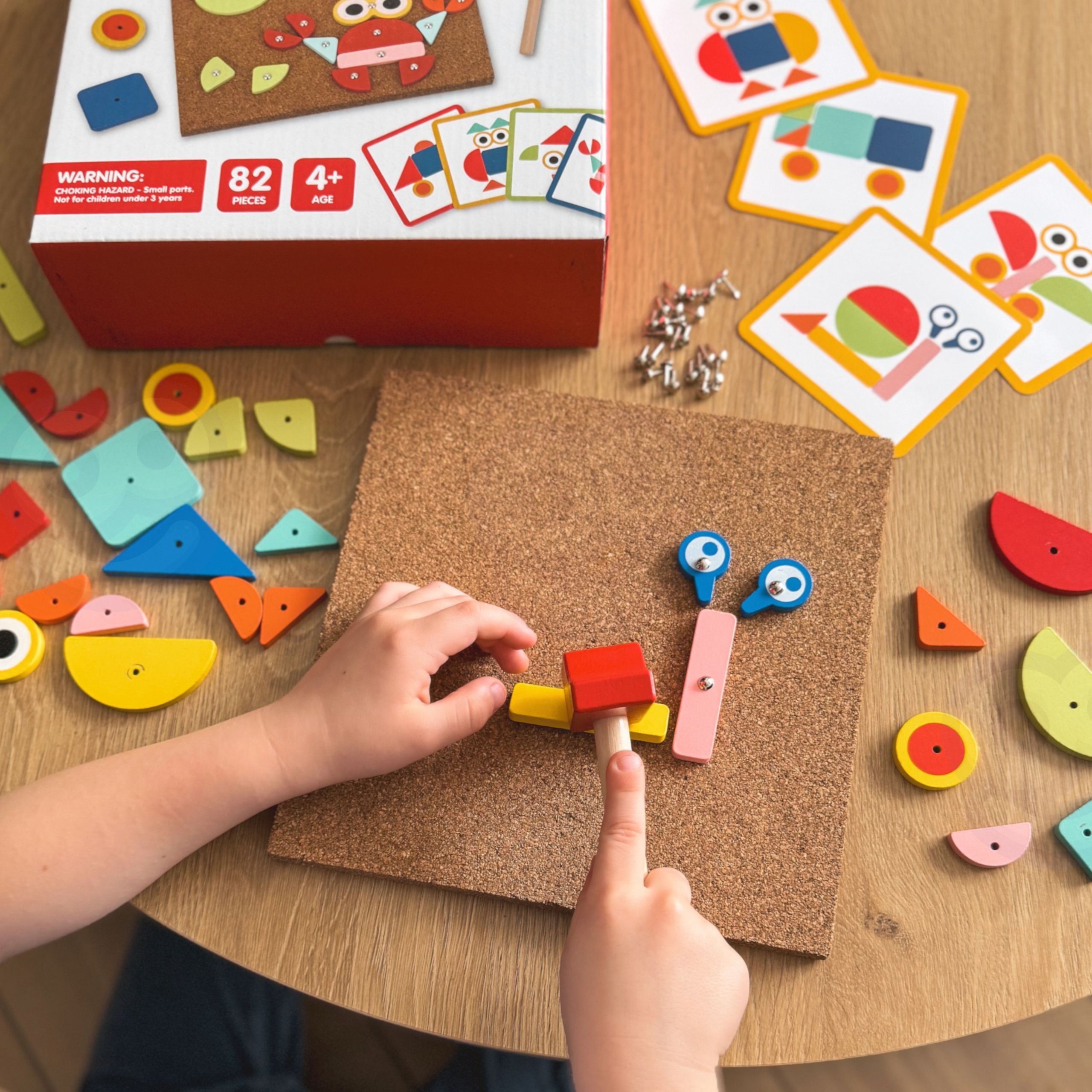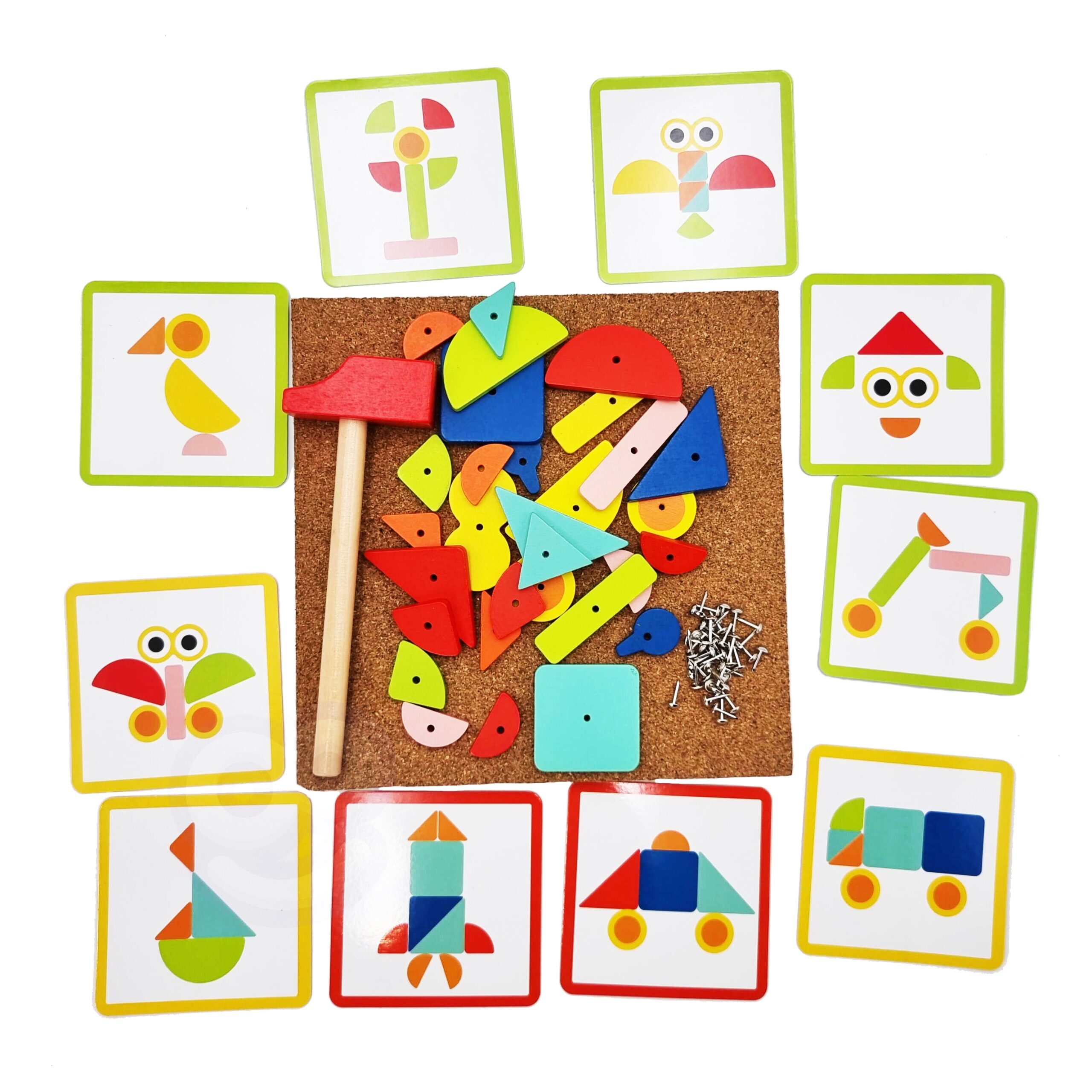 Mängu alustamiseks valige kaart ja asetage see korktahvlile. Kasutades haamrit ja naelu, kinnitage klotsid tahvlile vastavalt valitud mustrile. Lapsed saavad ka ise uusi mustreid luua, kasutades oma loovust ja kujutlusvõimet.