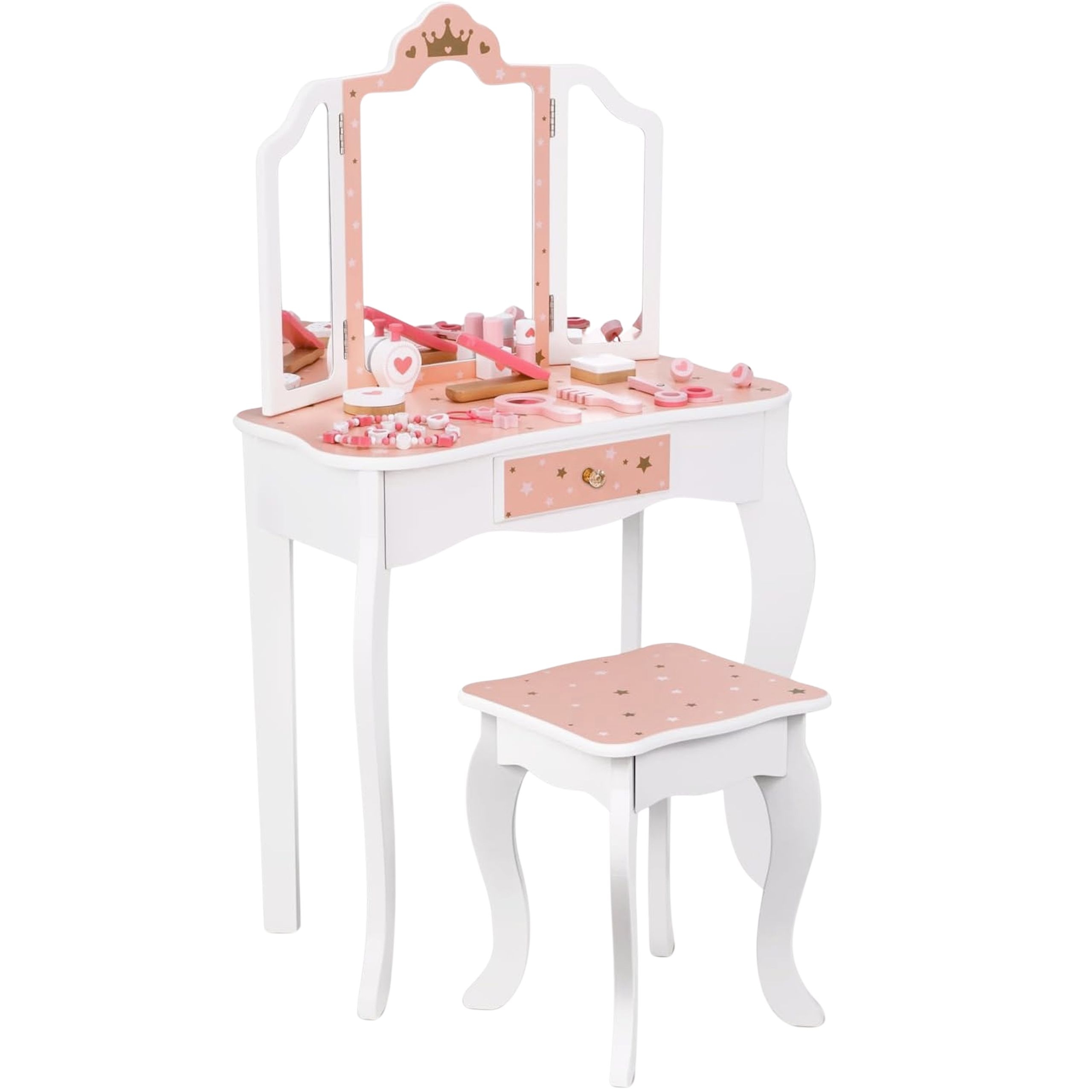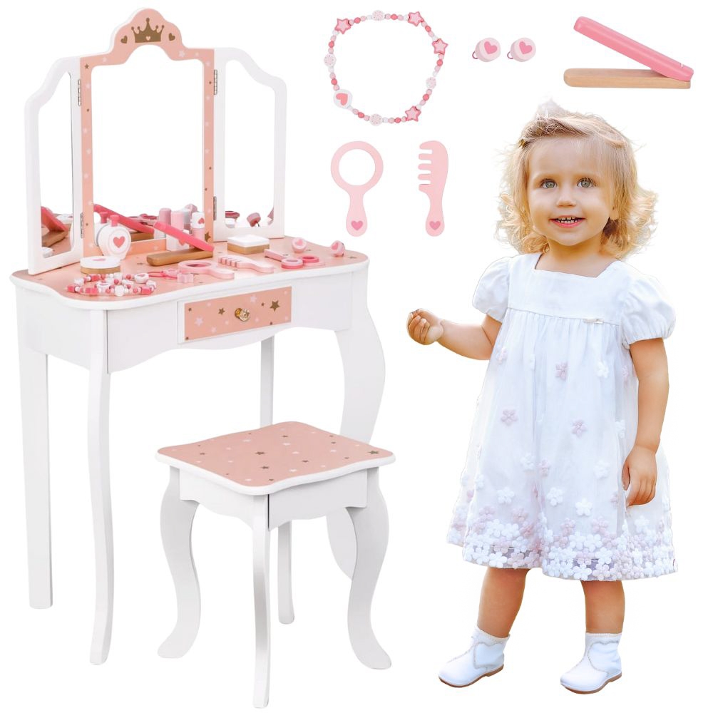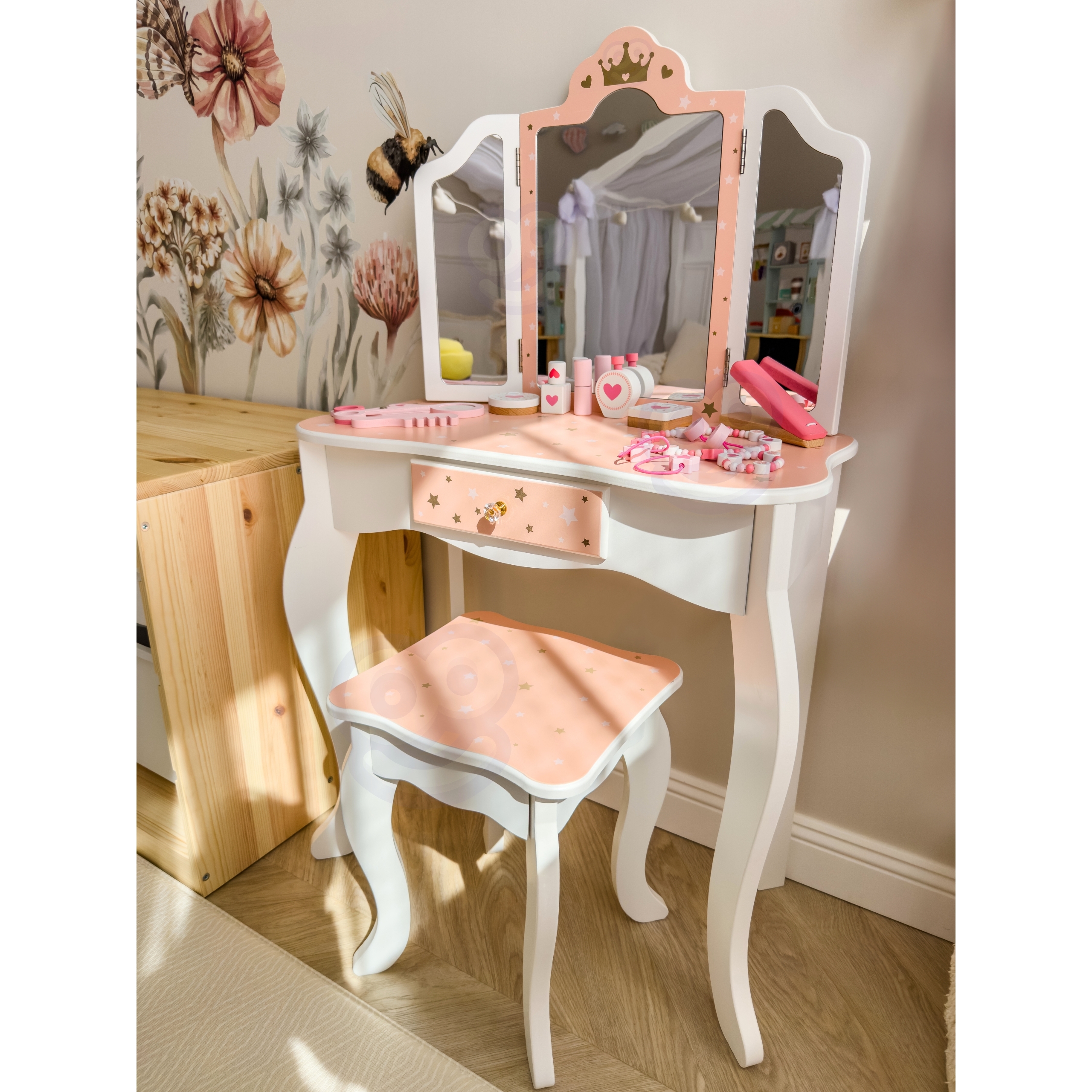 Komplekti kuulub puidust tualettlaud koos peegli ja sahtliga, sobiv tool ning mitmesugused puidust meigi- ja juuksurisõbralikud tarvikud. Lapsed saavad mängida juuksurit ja stilisti, kasutades kammide, käärid ja fööni, samuti meigitarvikuid nagu puudripintsel ja huulepulk. Lisaks sisaldab komplekt ehteid nagu kaelakeed ja käevõrud ning väikeseid juuksekaunistusi.