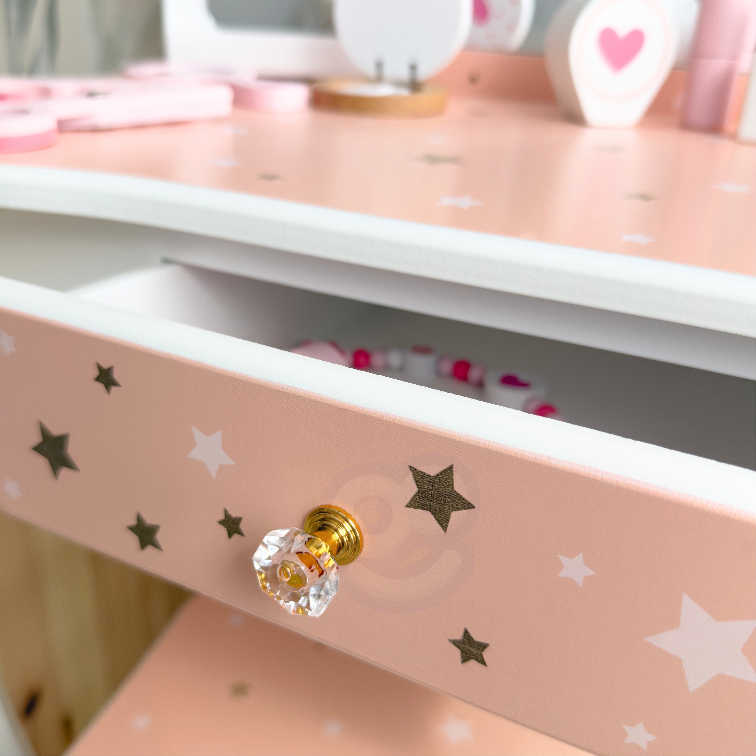 See tualettlauakomplekt on suurepärane kingitus, mis pakub tundideks mängulusti ja aitab arendada lapse enesekindlust ning loovust. See on ideaalne täiendus igale lastetoale, lisades sellele nii funktsionaalsust kui ka esteetilist väärtust.