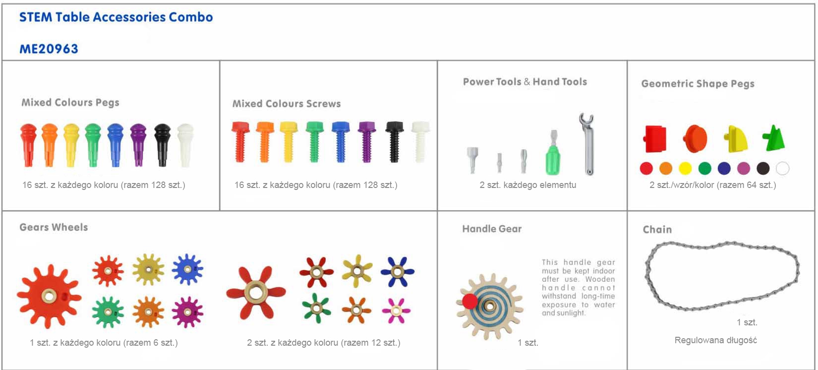 Komplekt on mõeldud kasutamiseks koos seinaplaatide või lauaplaatidega, mis tuleb eraldi soetada. Lapsed saavad kasutada neid tarvikuid mitmesuguste mustrite ja konstruktsioonide loomiseks, mis pakuvad tundideks tegevust ja avastamisrõõmu.
