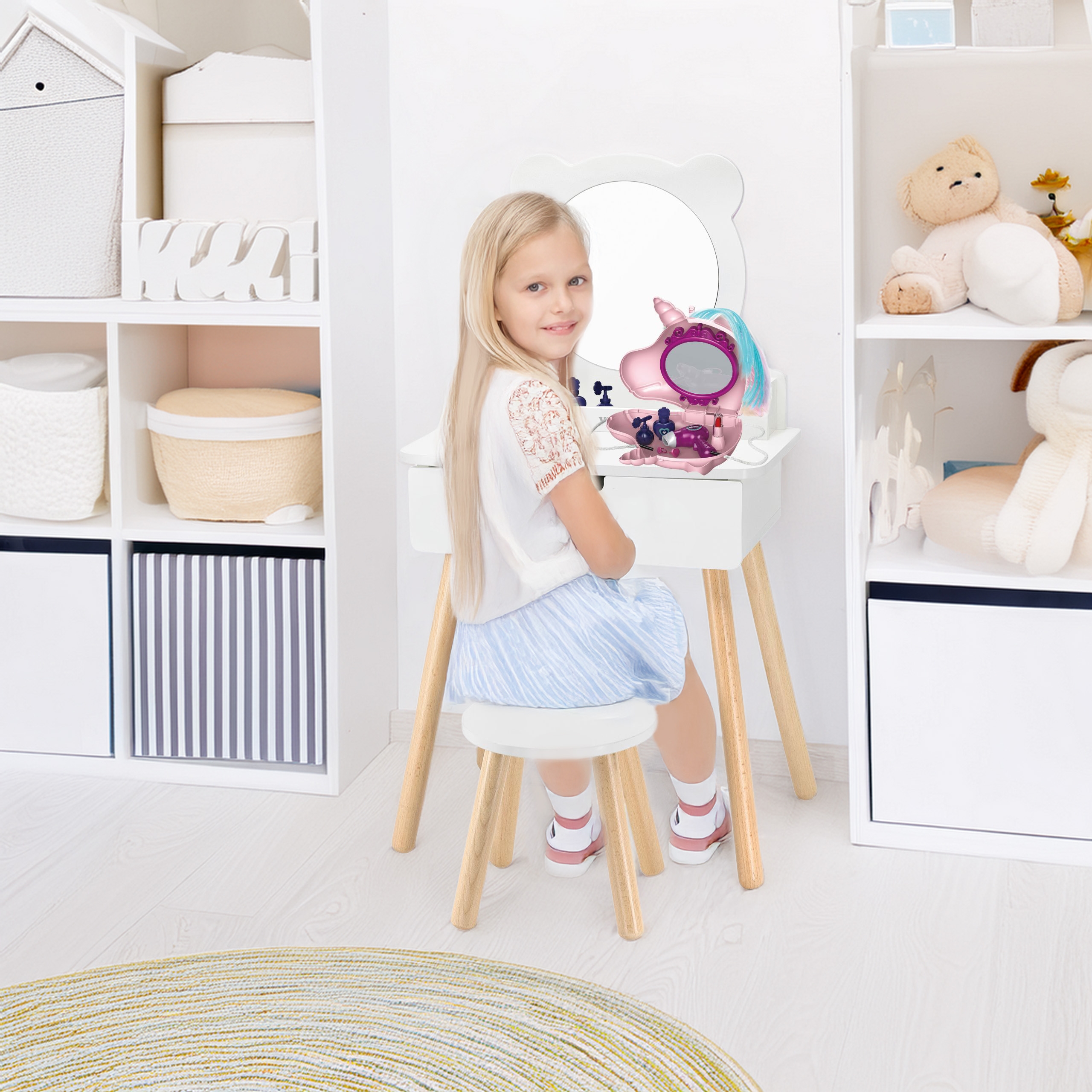 Elegantne valge tualettlaud koos tarvikutega on ideaalne täiendus igale tüdrukute toale. See praktiline komplekt pakub lastele võimalust mängida ilusalongi, arendades samal ajal loovust ja kujutlusvõimet. Komplekti kuulub ka mugav tool, mis sobib ideaalselt väikestele printsessidele.