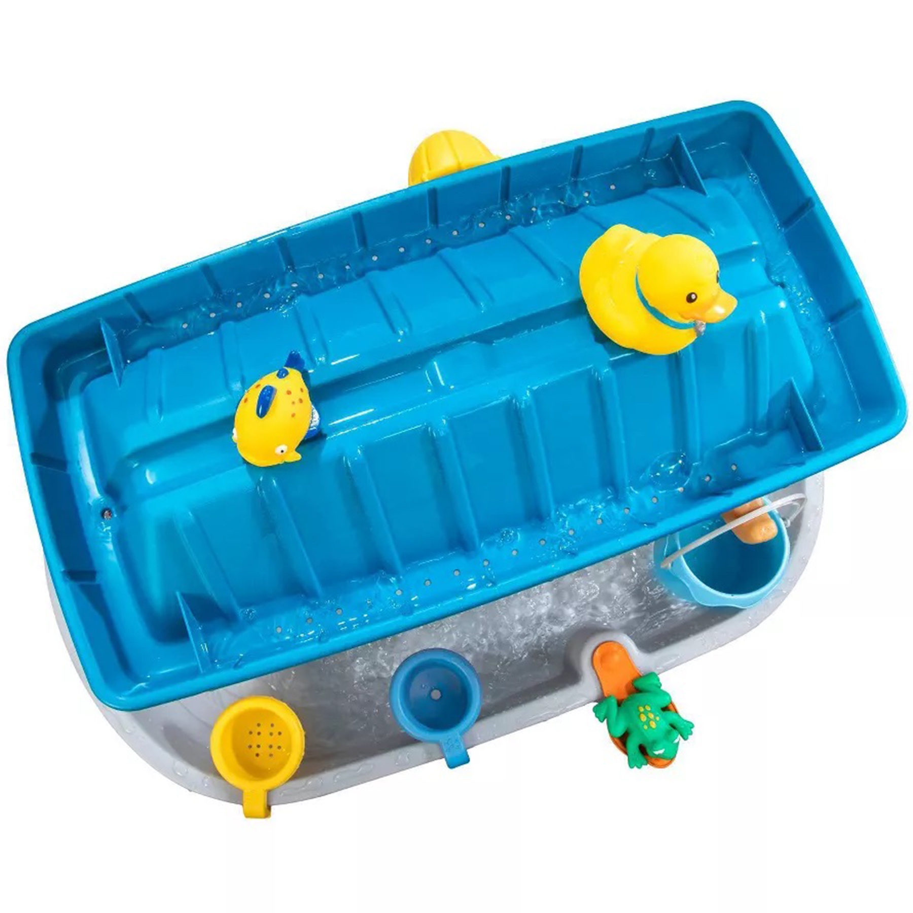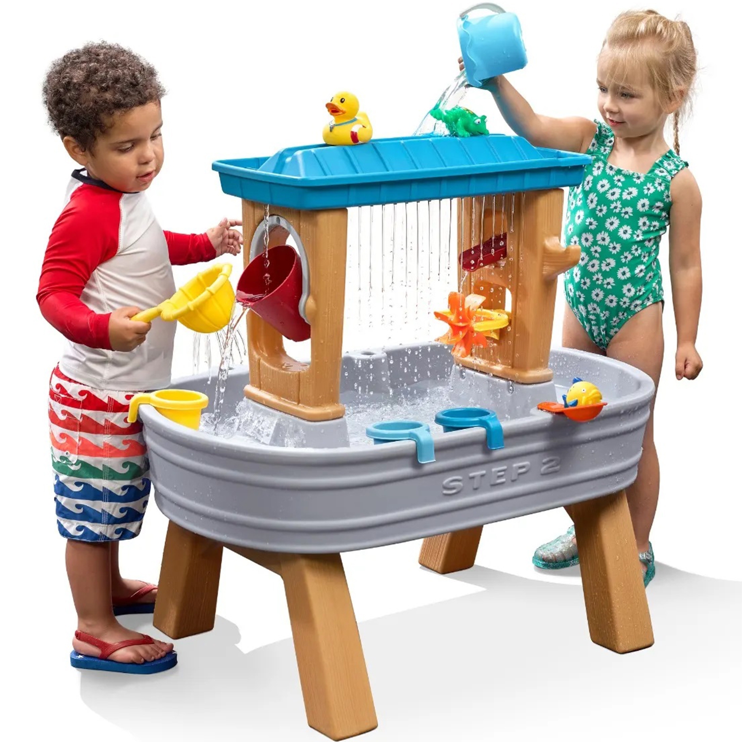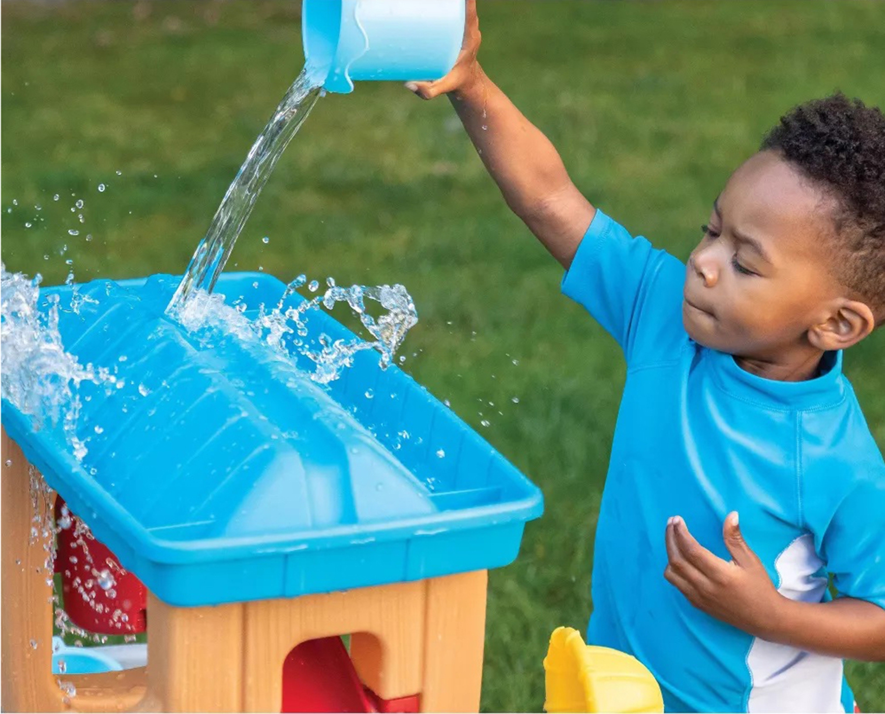 Veemängulaud on lihtne kokku panna ja see nõuab täiskasvanu abi. Kui vesi on laua ülaossa valatud, hakkab see voolama alla, luues realistliku vihmaefekti. Üks külg suunab vee ämbrisse, mis täitumisel kallutab ja valab vee välja, samal ajal kui teine külg suunab vee rennile, mis paneb pöörleva veeratta liikuma.