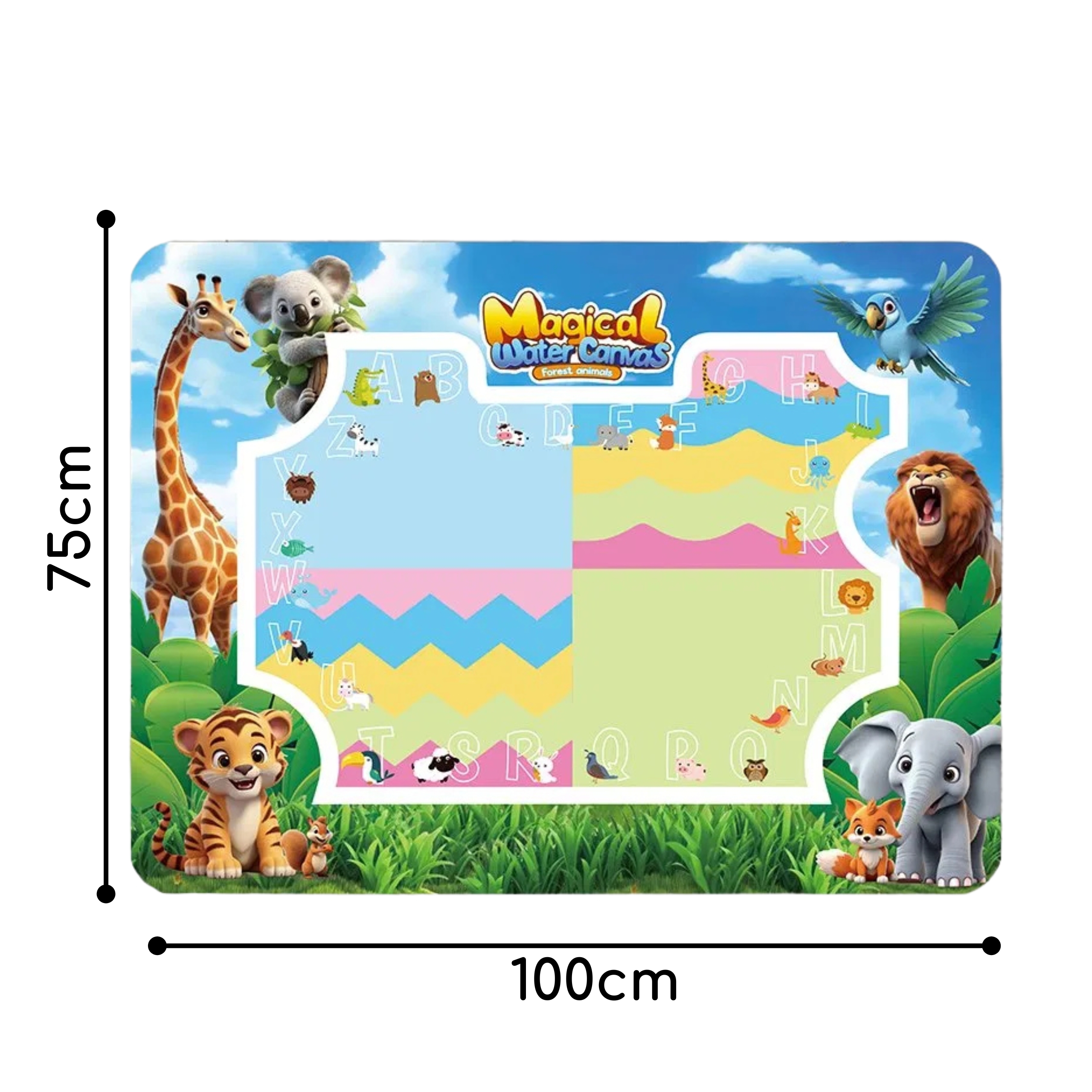 Laste veematt joonistamiseks on ideaalne vahend loovuse ja õppimise edendamiseks. See võimaldab lastel avastada värve, tähti, numbreid ja kujundeid ilma tindi või värvide kasutamiseta. Suure formaadiga matt pakub piisavalt ruumi, et joonistada koos perega ning lõbusad džungliloomade pildid julgustavad õppimist läbi mängu.