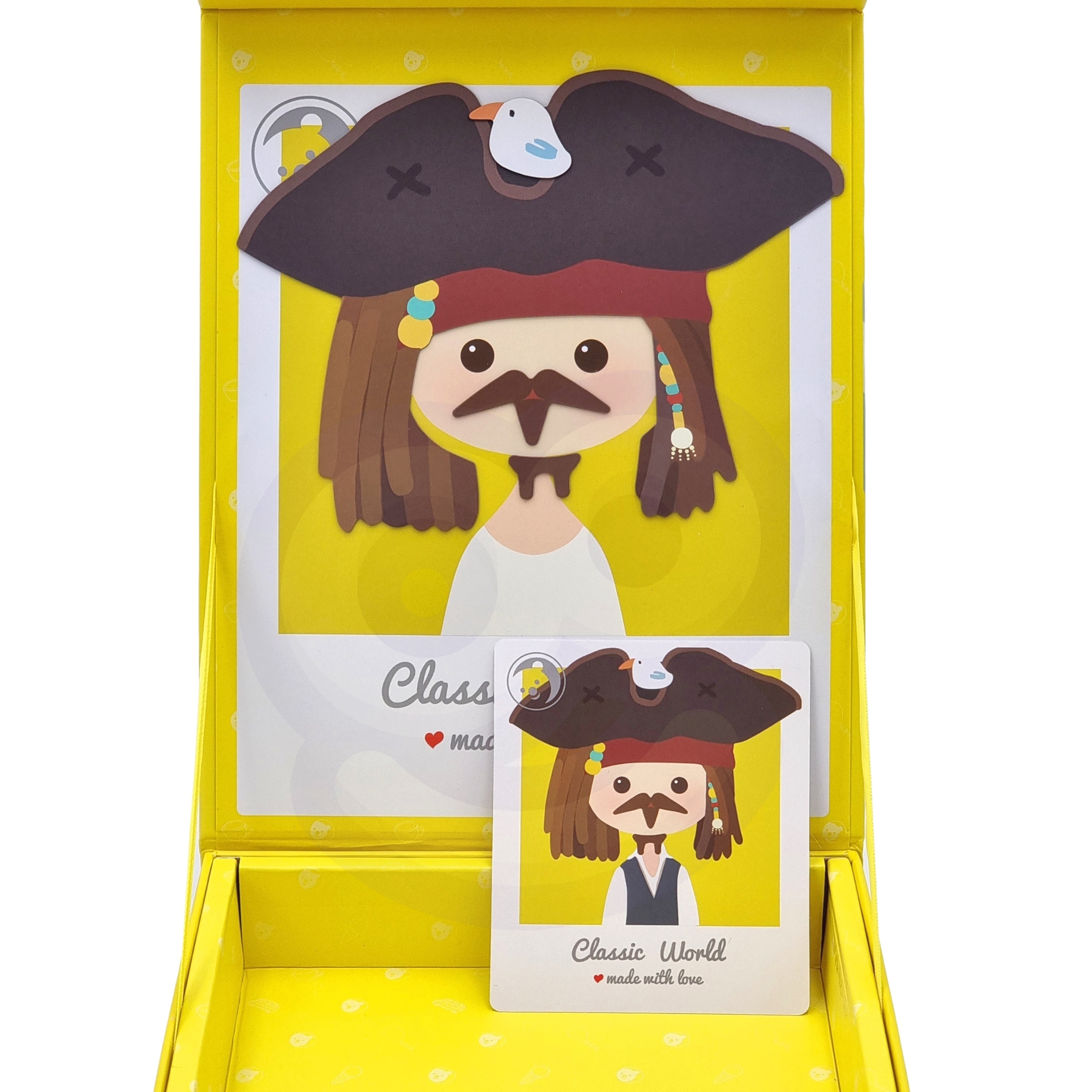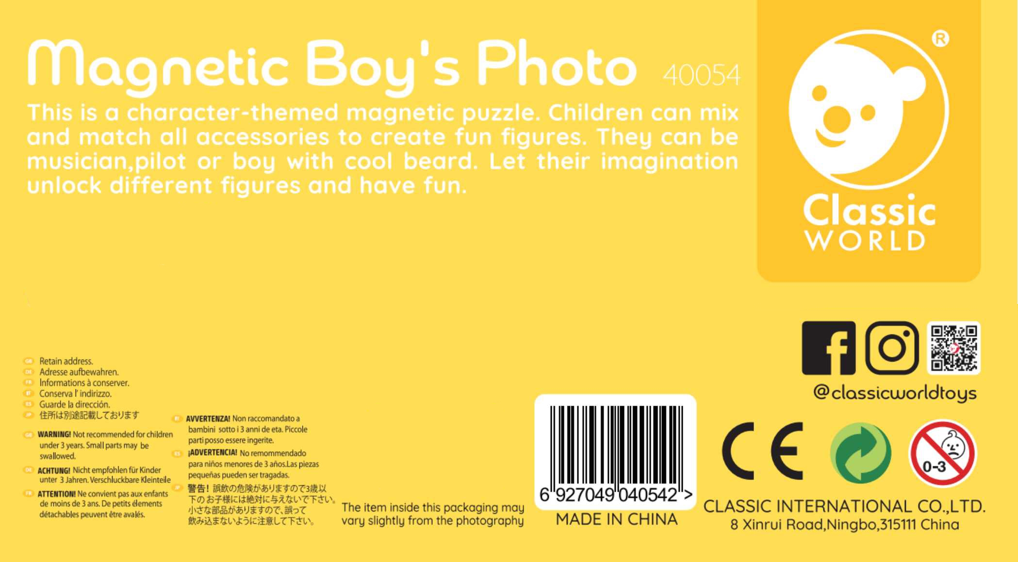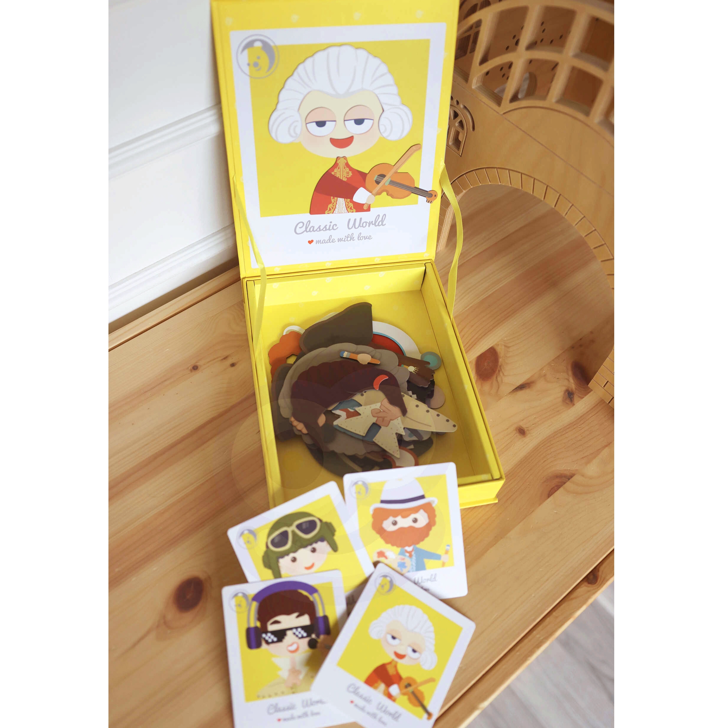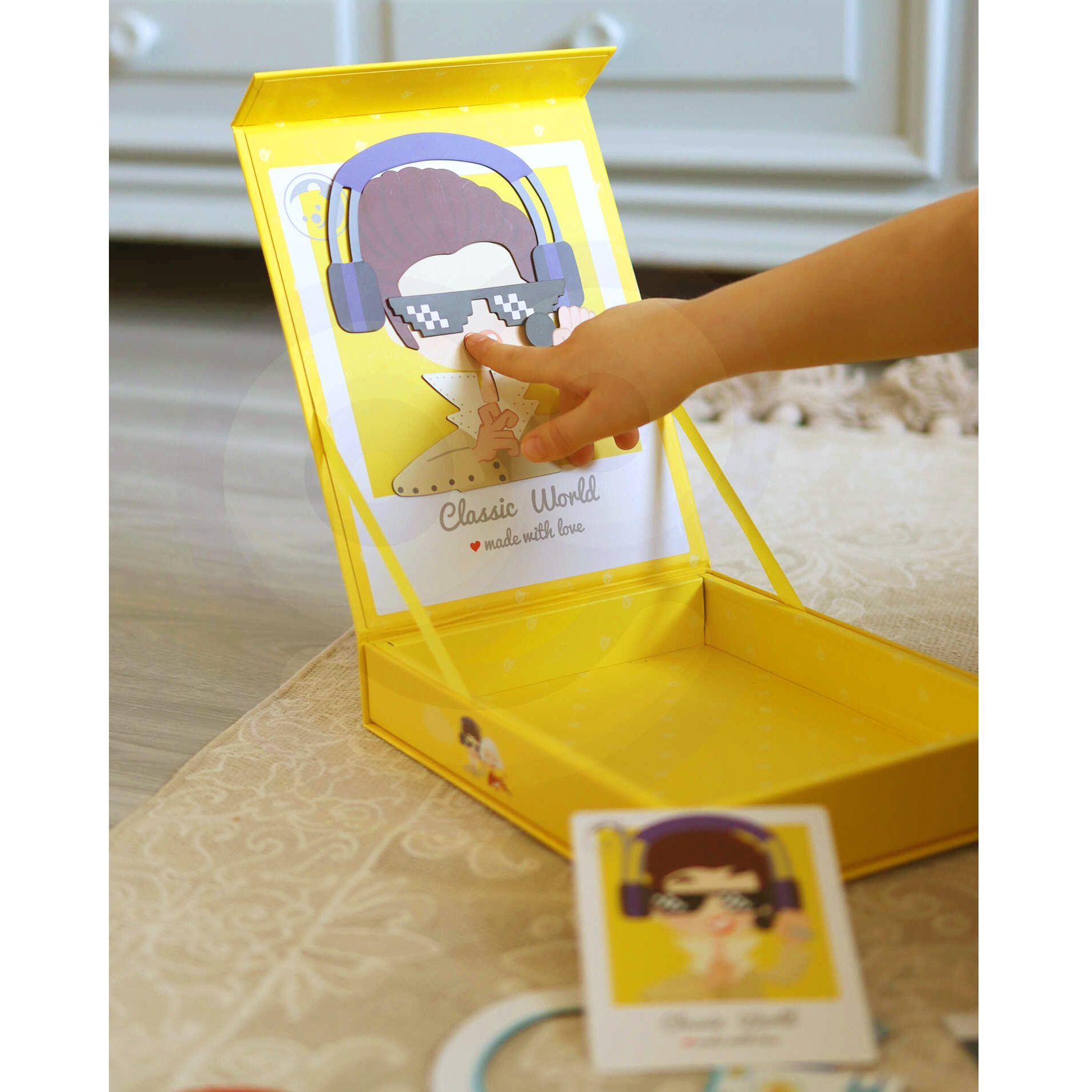 Komplekt sisaldab magnetilise tahvliga karpi, 32 magnetilist elementi nagu soengud, habemed, riided ja aksessuaarid ning 8 kaarti poiste kostüümide mustritega. See on ideaalne reisikaaslane või mängukaaslane vanaema juures.