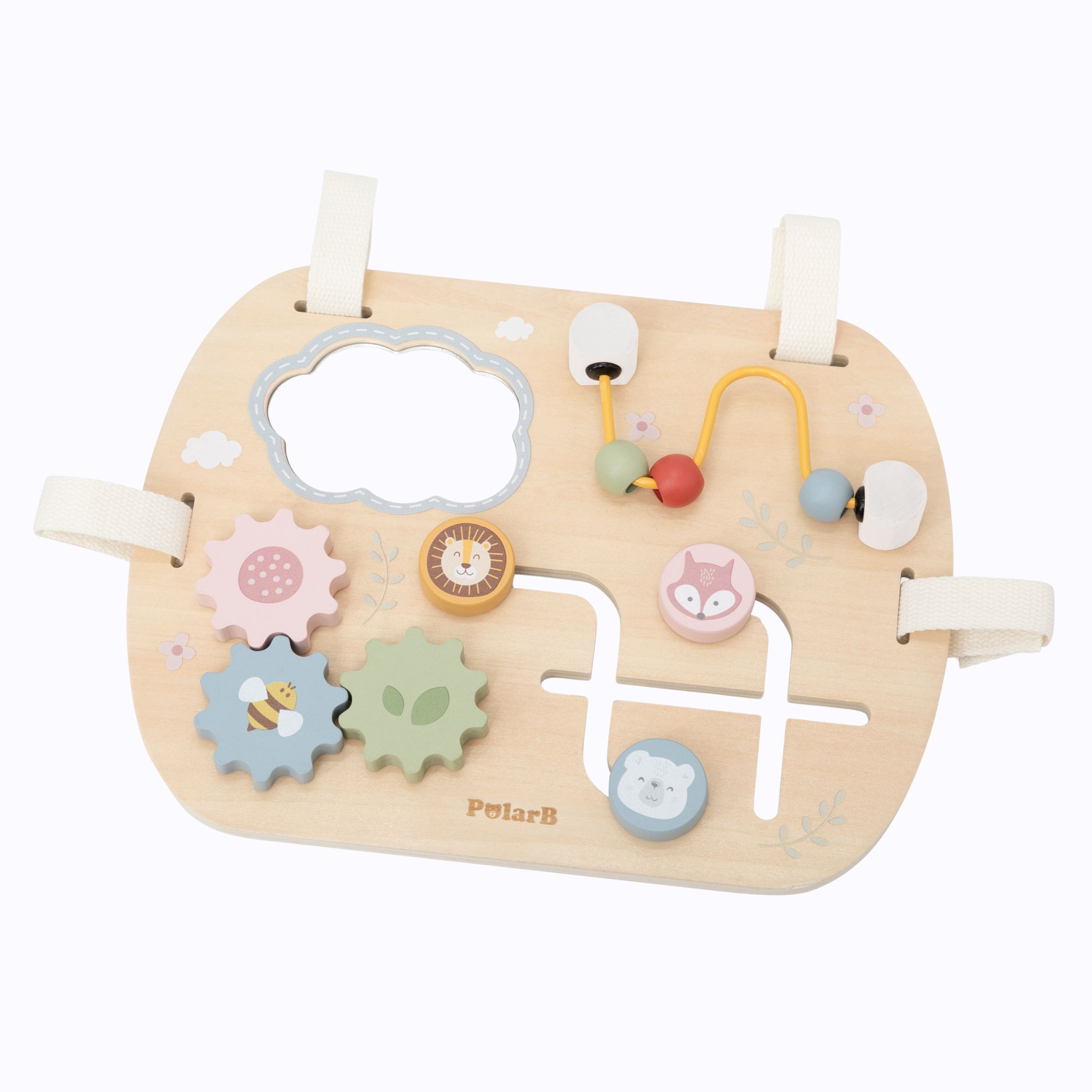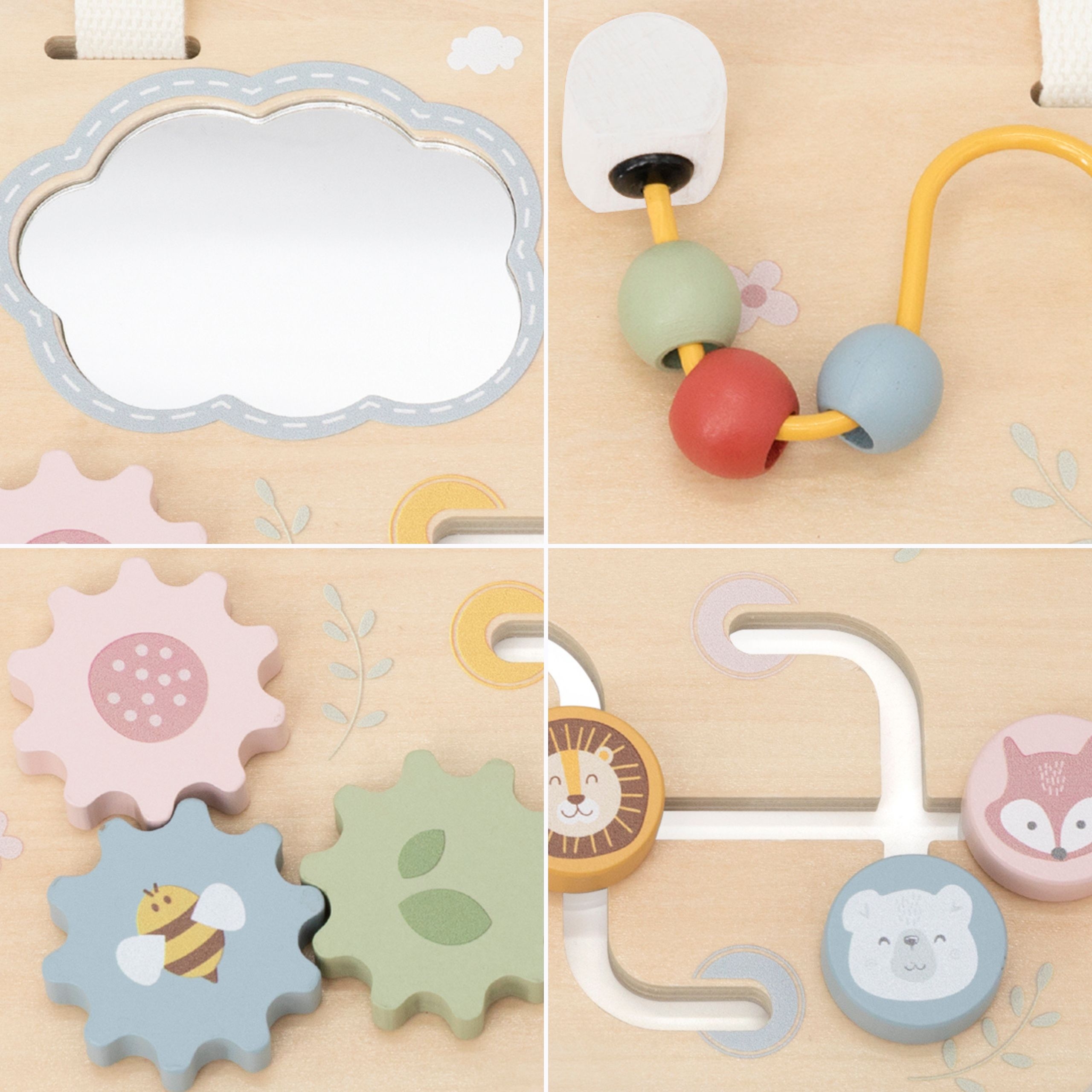 Mitmekülgne puidust mängulaud on ideaalne hariv mänguasi väikestele avastajatele. Sellel on erinevad elemendid, mis köidavad laste tähelepanu – peegel, helmestega labürint, hammasrattad ja liugur. Iga element toetab sensoorse arengu ja liigutuste koordineerimise õppimist läbi mängu. Pastelsed värvid ja meeldiv puudutustunne stimuleerivad meeli ja julgustavad eksperimenteerima.