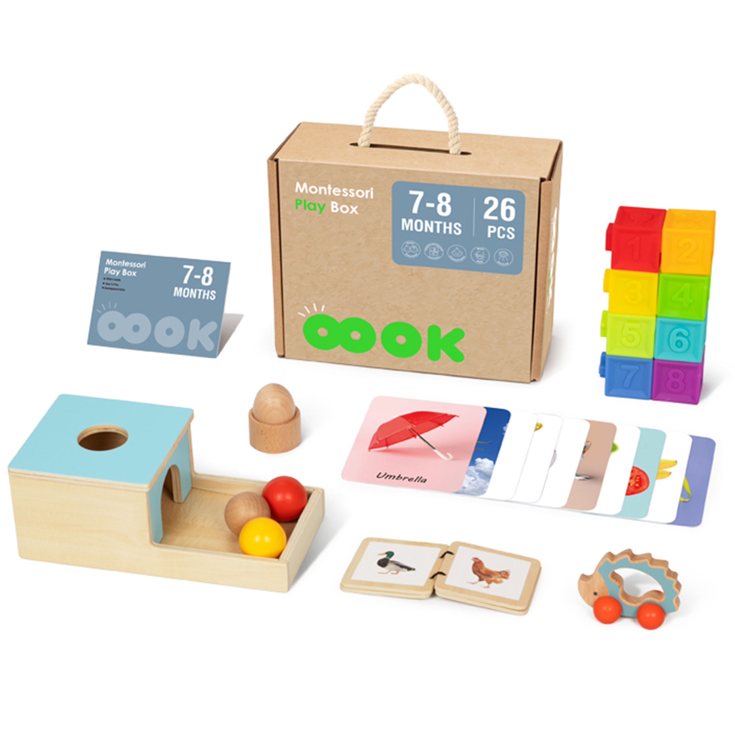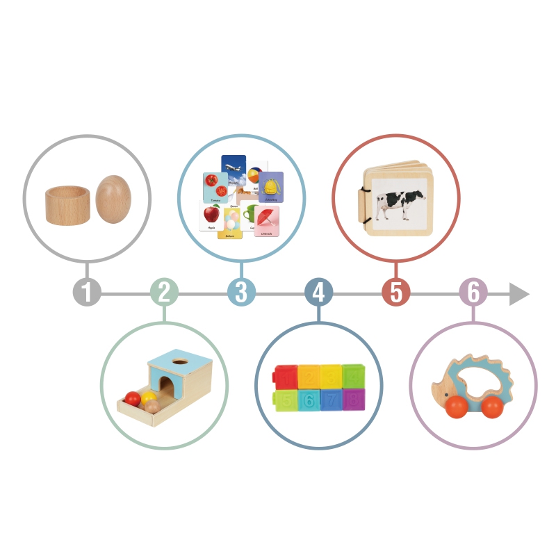 Komplekt sisaldab mitmeid Montessori stiilis mänguasju, sealhulgas puidust muna ja alus, mis aitavad arendada käe ja silma koordinatsiooni. Lisaks on komplektis erinevaid palli- ja kujundimänge, mis tutvustavad lapsele objektide püsivuse kontseptsiooni. Lapsed saavad ka õppida piltkaarte kasutades objektide ja nimetuste seostamist, mis arendab mälu ja keeleoskust. Pehmed kummist klotsid ja puidust loomaraamat aitavad arendada lapse meeli ja tutvustada talle loomade maailma.