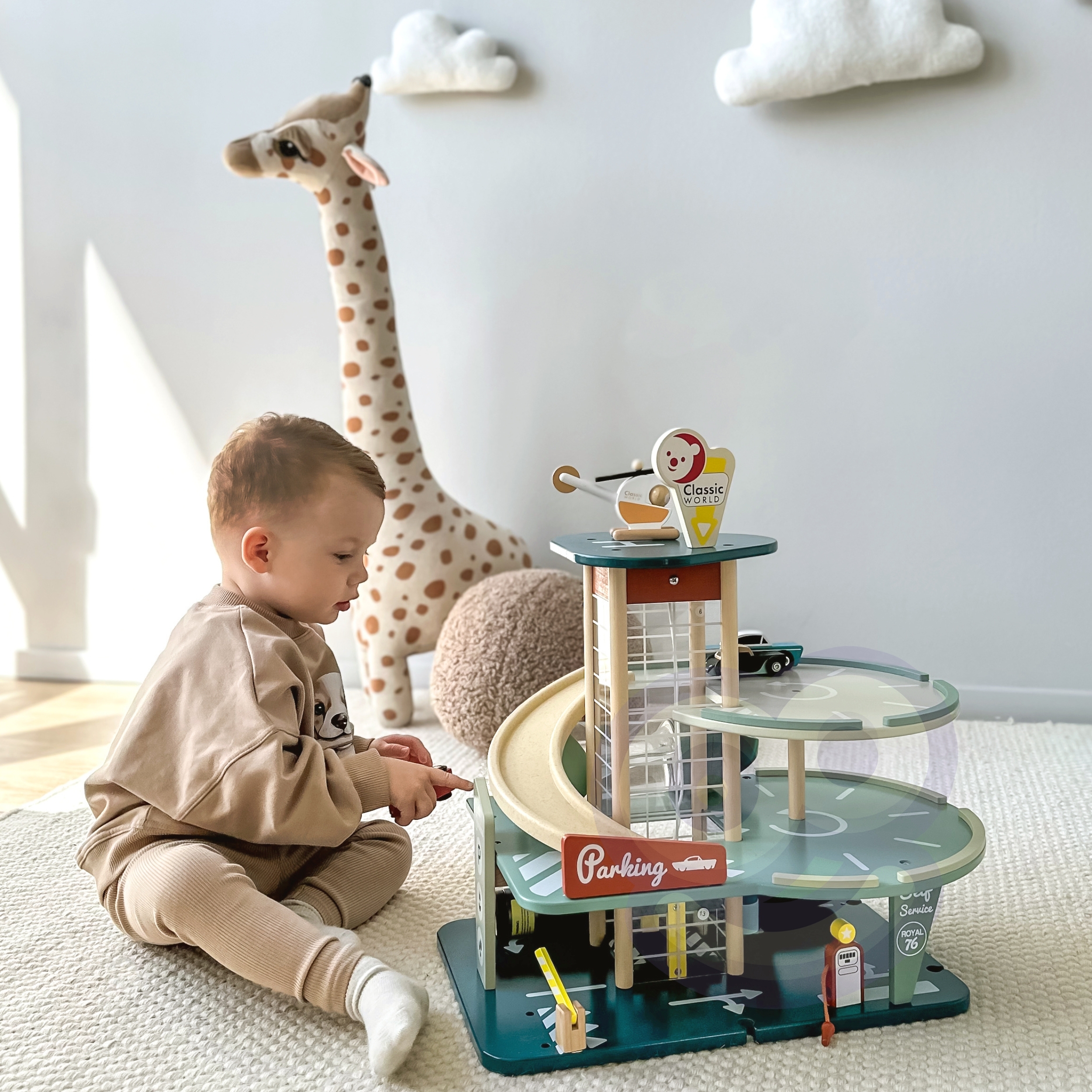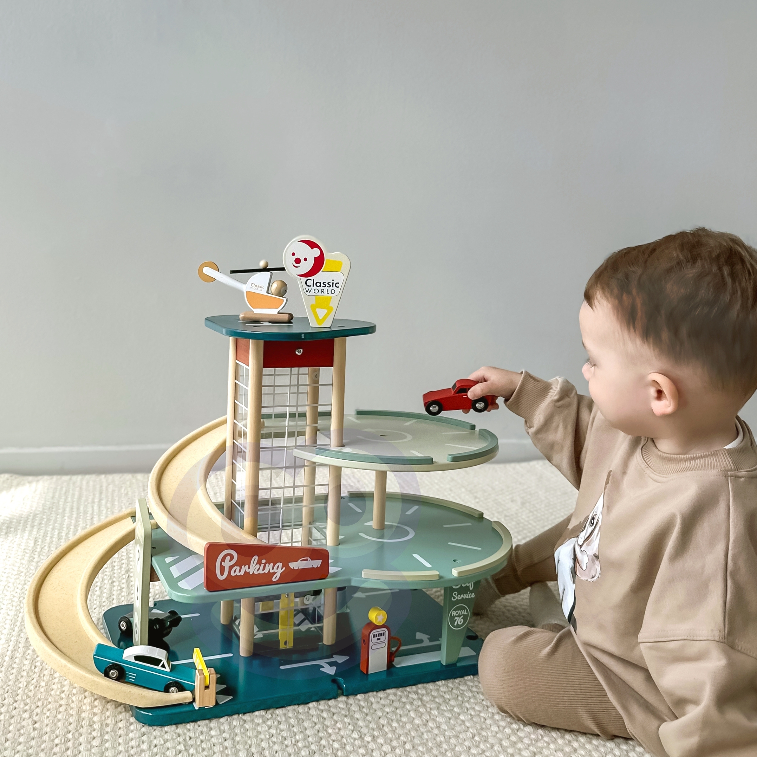 See mitmetasandiline autoparkla komplekt viib lapsed ajarännakule 1950ndatesse, pakkudes lõputut mängurõõmu. Komplekt sisaldab stiilseid autosid, autopesulat, kütusejaama ja bioplastist kaldteid, mis viivad parkimisalale. Lift ühendab kõiki kolme tasandit ja selle tipus on maandumisplatvorm helikopterile. Mänguasja abil arenevad laste motoorsed ja keelelised oskused, samuti sotsiaalsed oskused läbi ühismängu.