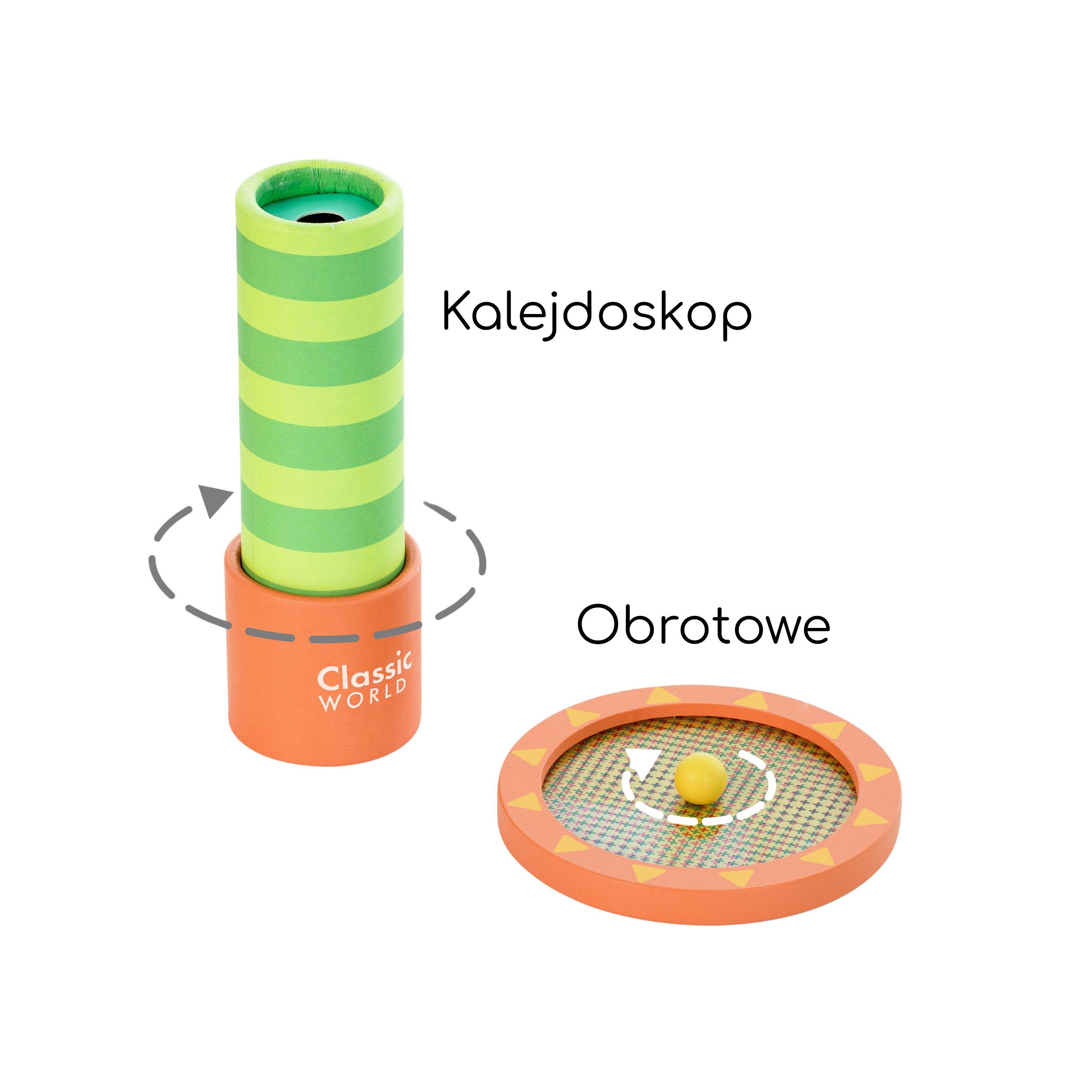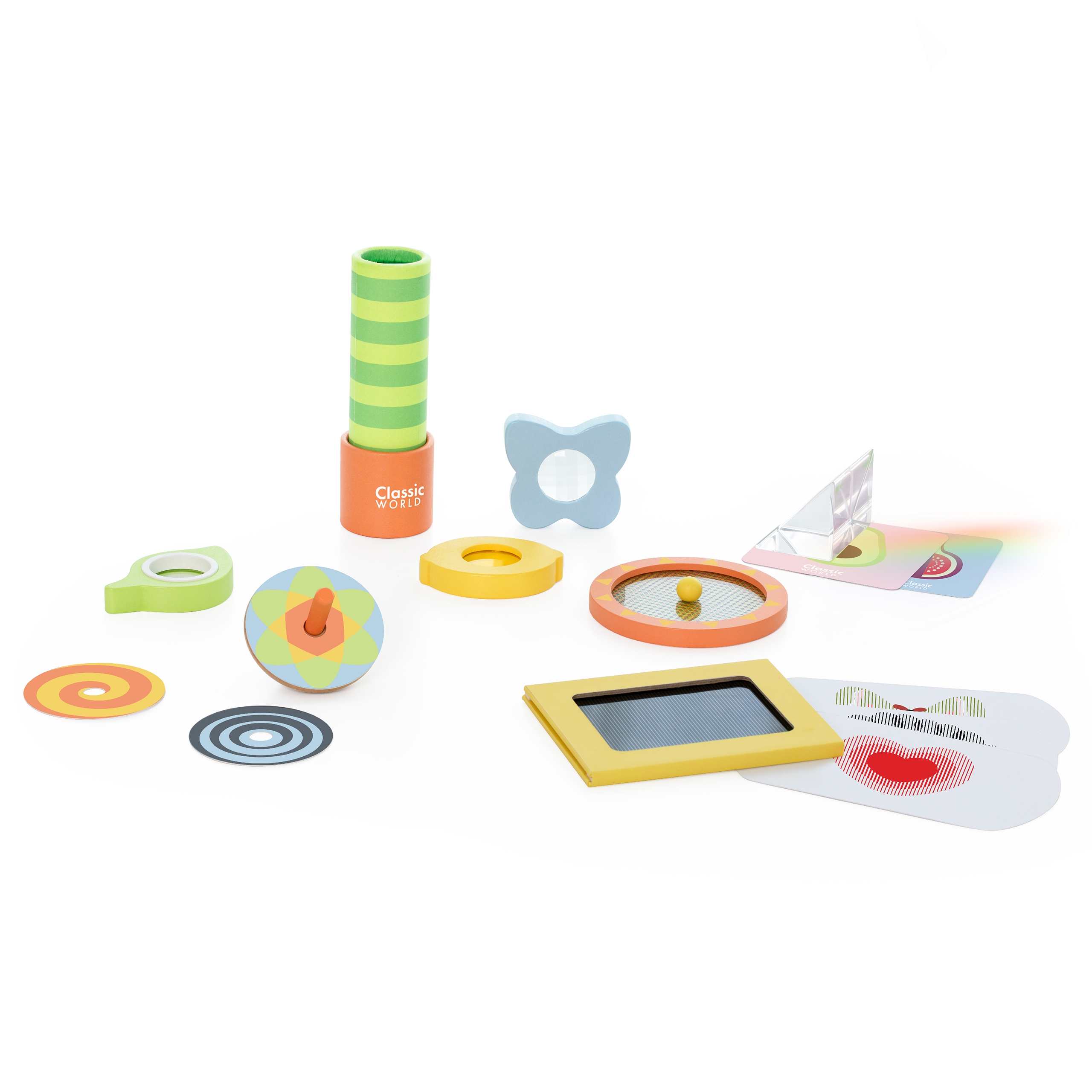 Komplekti kuuluvad erinevad elemendid, nagu kaleidoskoop, mis pakub lapsele uusi vaatenurki maailmale. Kolm erinevat läätse muudavad ümbritseva keskkonna värvi, kuju ja suurust. Prismo ja optiline võre pakuvad põnevaid visuaalseid illusioone, samas kui piltide animaator toob ellu kuus erinevat pilti, mis liiguvad ja elustuvad lapse käe all.