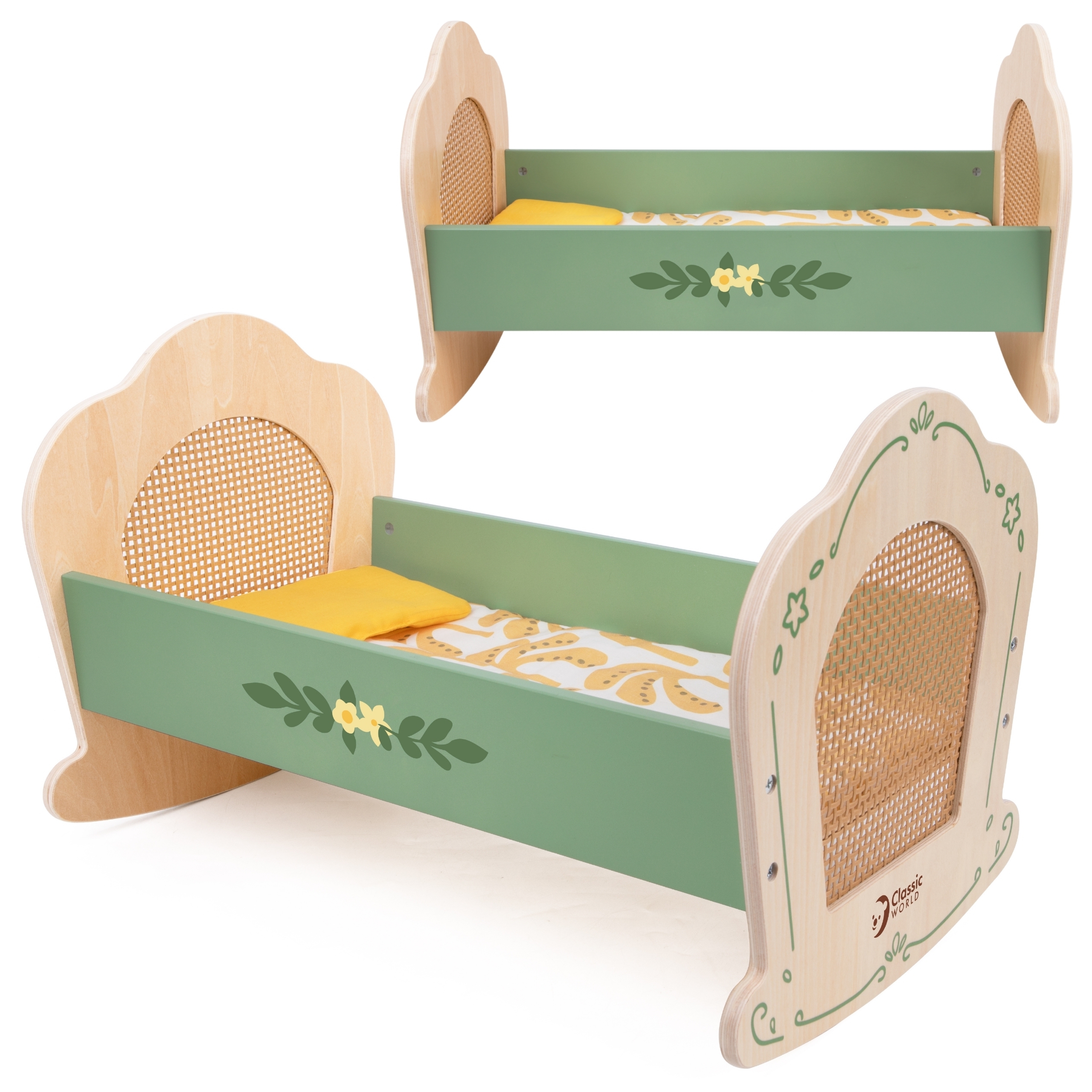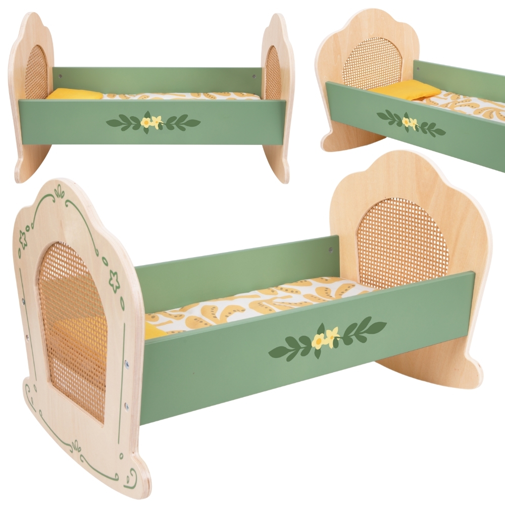 See kaunis puidust nukuvoodi ühendab endas vintage stiili ajatu võlu ja naturaalse rotangi ilu. Rohelistes toonides voodi on ideaalne täiendus igale lapse kodumängule, pakkudes nukule või kaisukarule mugavat puhkepaika. Peened dekoratiivsed detailid ja pehme voodipesukomplekt tagavad, et nukk saab nautida rahulikku und.