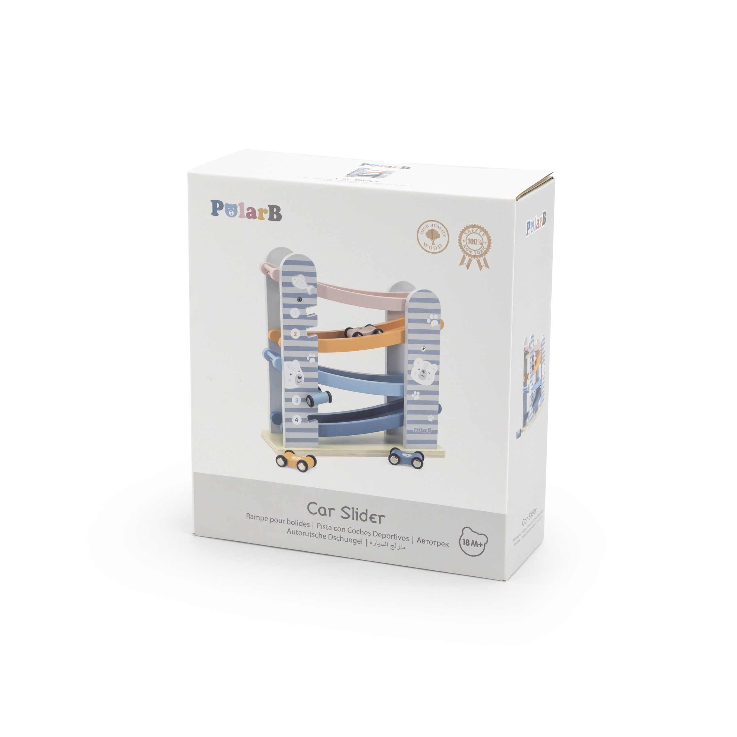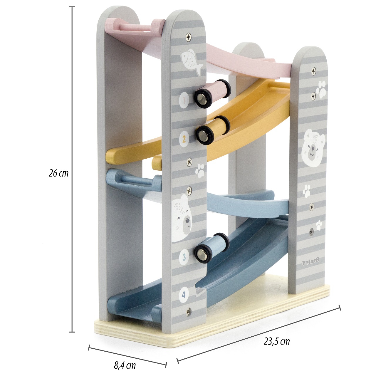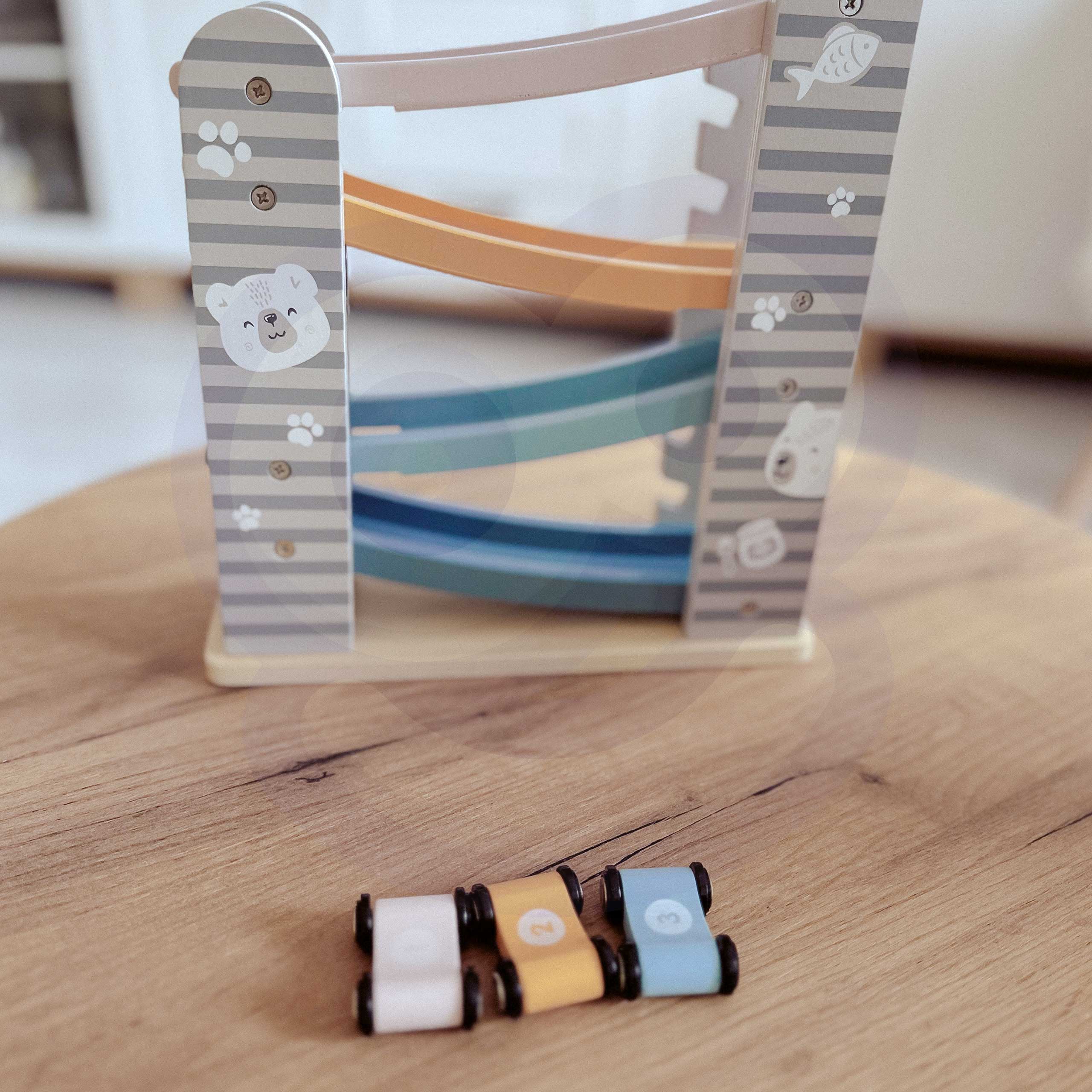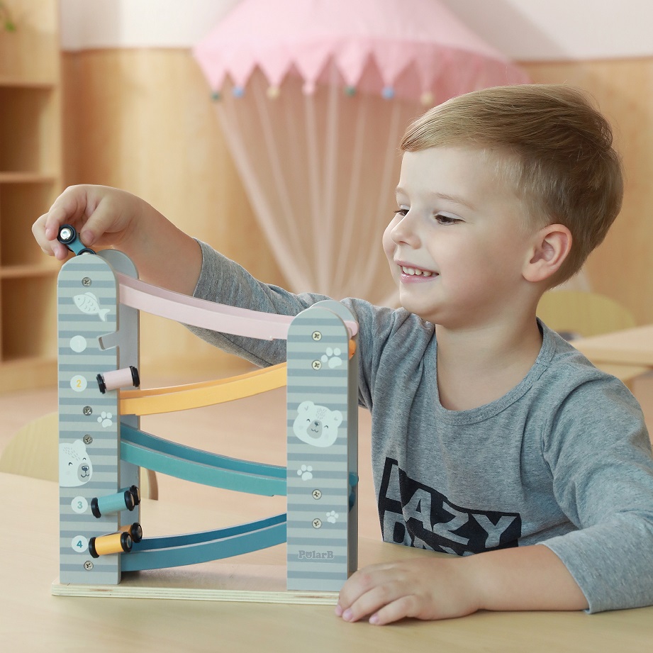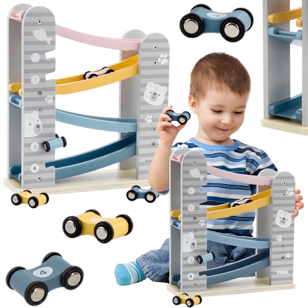 Puidust rallirada on suurepärane mänguasi väikestele autosõpradele, pakkudes lihtsat konstruktsiooni ja põnevat võidusõiduelamust. Pastelsete värvide ja ohutu disainiga sobib see ideaalselt lastetuppa. Neli värvilist autot numbritega laskuvad rajal, õpetades samal ajal planeerimist ja tähelepanu.