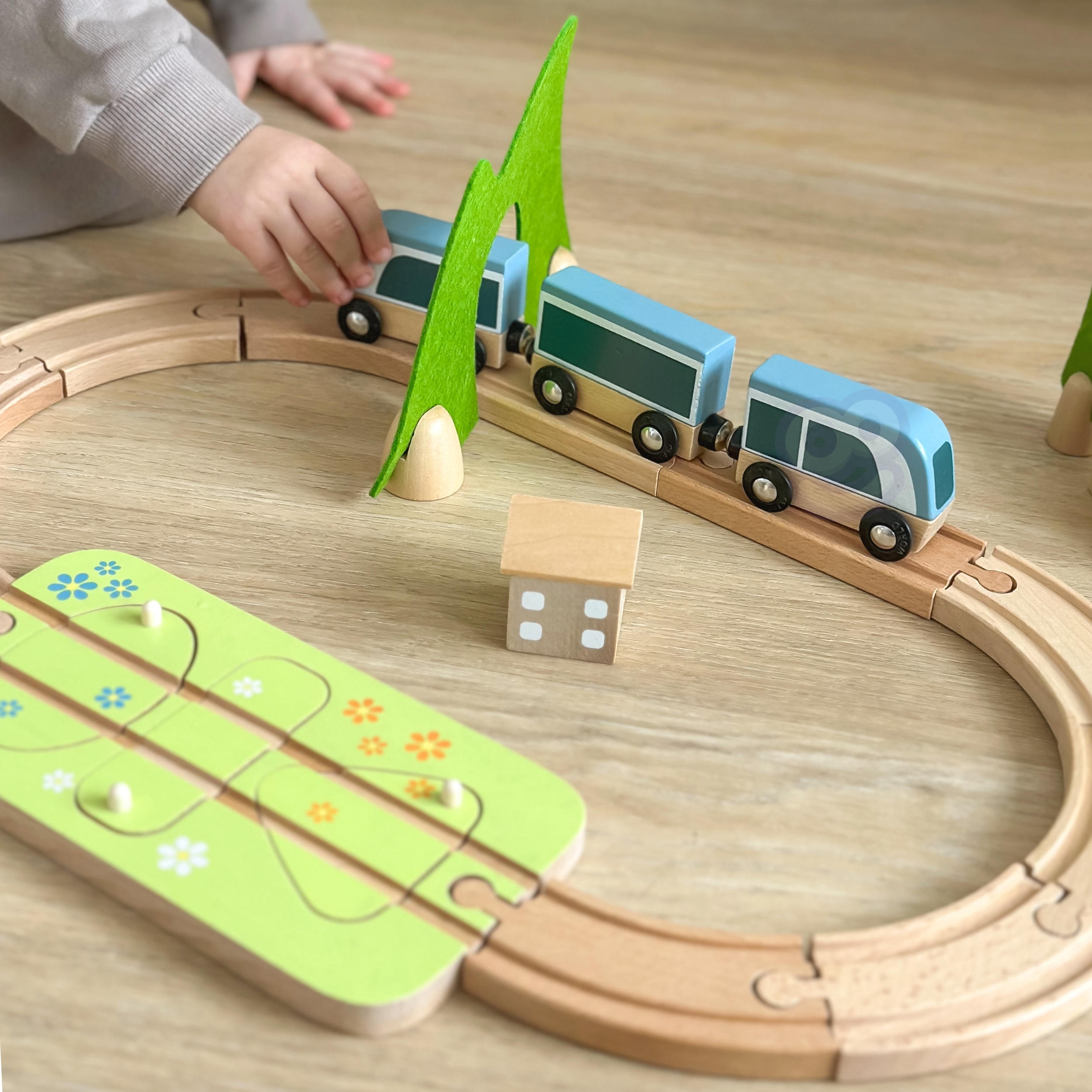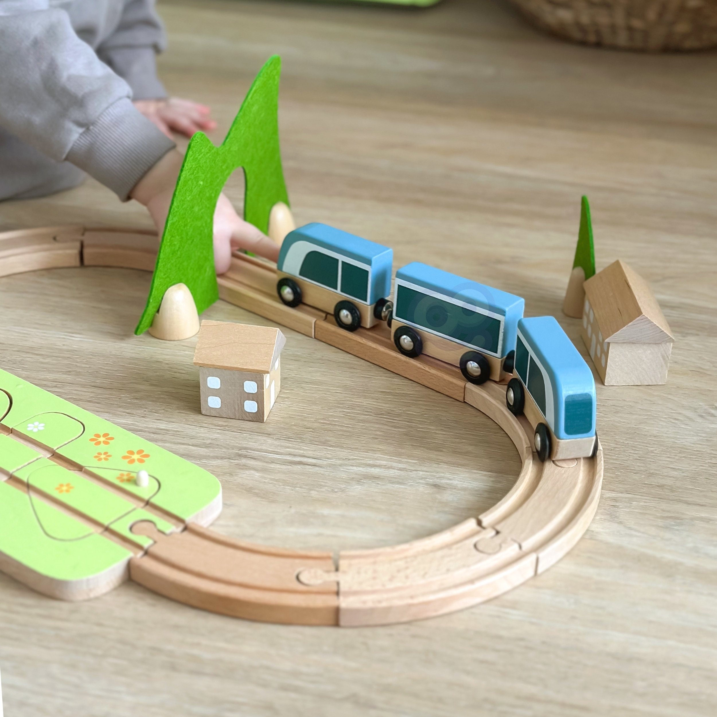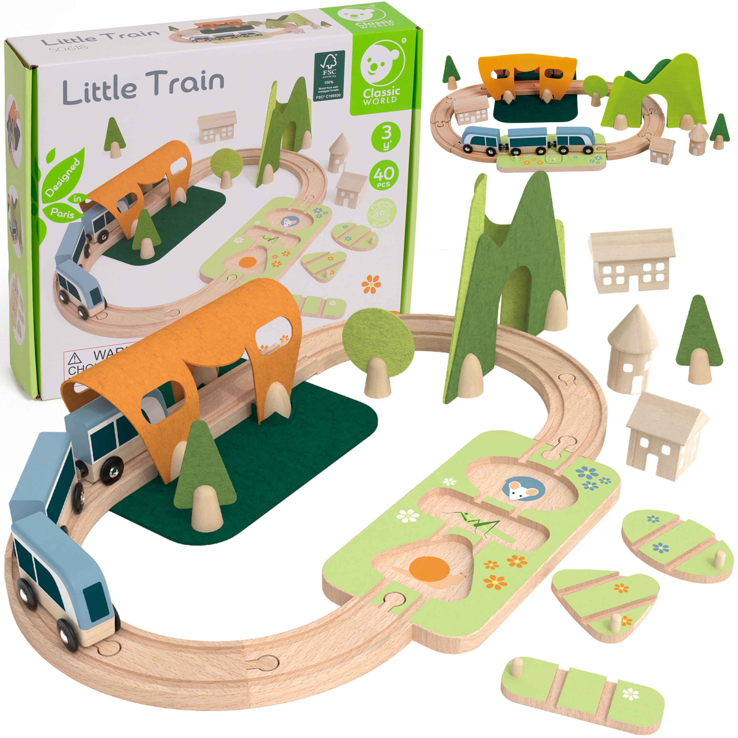 Valmistu põnevaks teekonnaks kujutlusvõime maailmas selle puidust rongikomplektiga! See eriline komplekt pakub mitte ainult kaunilt valmistatud rongi, vaid ka rada, mis on täis üllatusi ja dekoratsioone. Värvilised elemendid köidavad tähelepanu ning looduslikud materjalid tagavad turvalise mängimise. Ideaalne mänguasi õppimiseks läbi mängu Montessori vaimus.