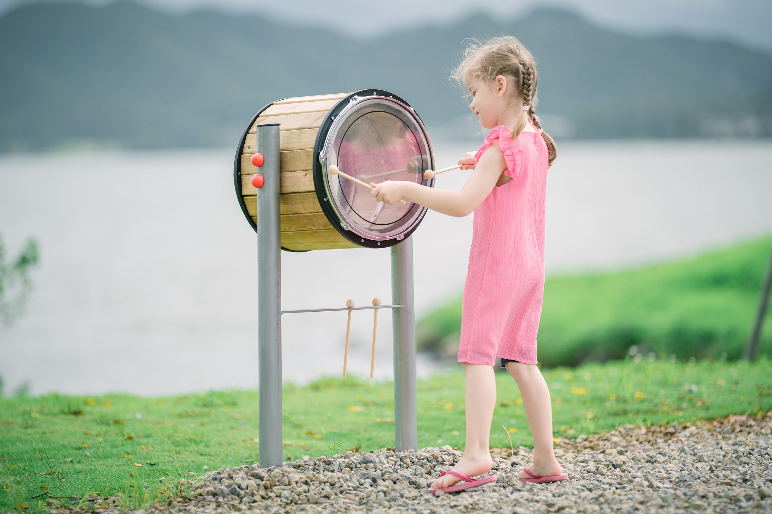 Suured trummikomplektid toovad muusika igasse aeda või mänguväljakule, pakkudes lastele võimalust luua oma harmooniaid ja rütme. Need trummid arendavad laste eneseväljendusoskust ning suurendavad nende enesekindlust. Korraga saavad mängida kaks last, kasutades mõlemat trummi külge. Komplektis on neli trummipulka, mida saab mugavalt hoiustada.