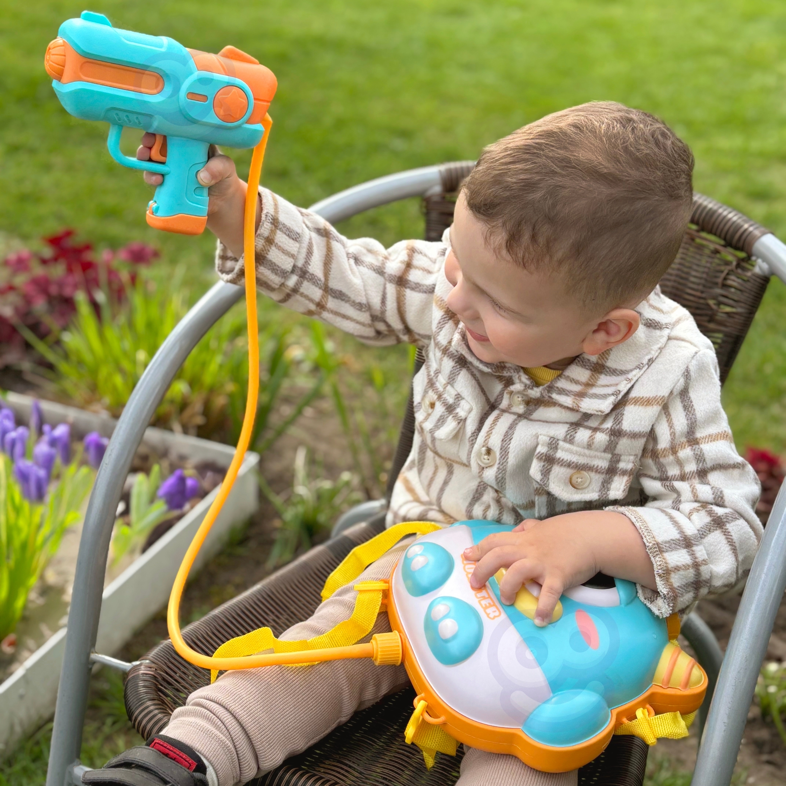 Veeprits plekiga on lõbus ja praktiline mänguasi, mis pakub lastele palju rõõmu ja jahutust kuumadel suvepäevadel. Värvikas, kosmoseolendit meenutav plekkott on varustatud reguleeritava rihmaga, et laps saaks seda mugavalt kanda. Veepritsil on kaks töörežiimi: täpne lask ja peen veepihustus, mis sobib ideaalselt kuumade ilmade leevendamiseks.